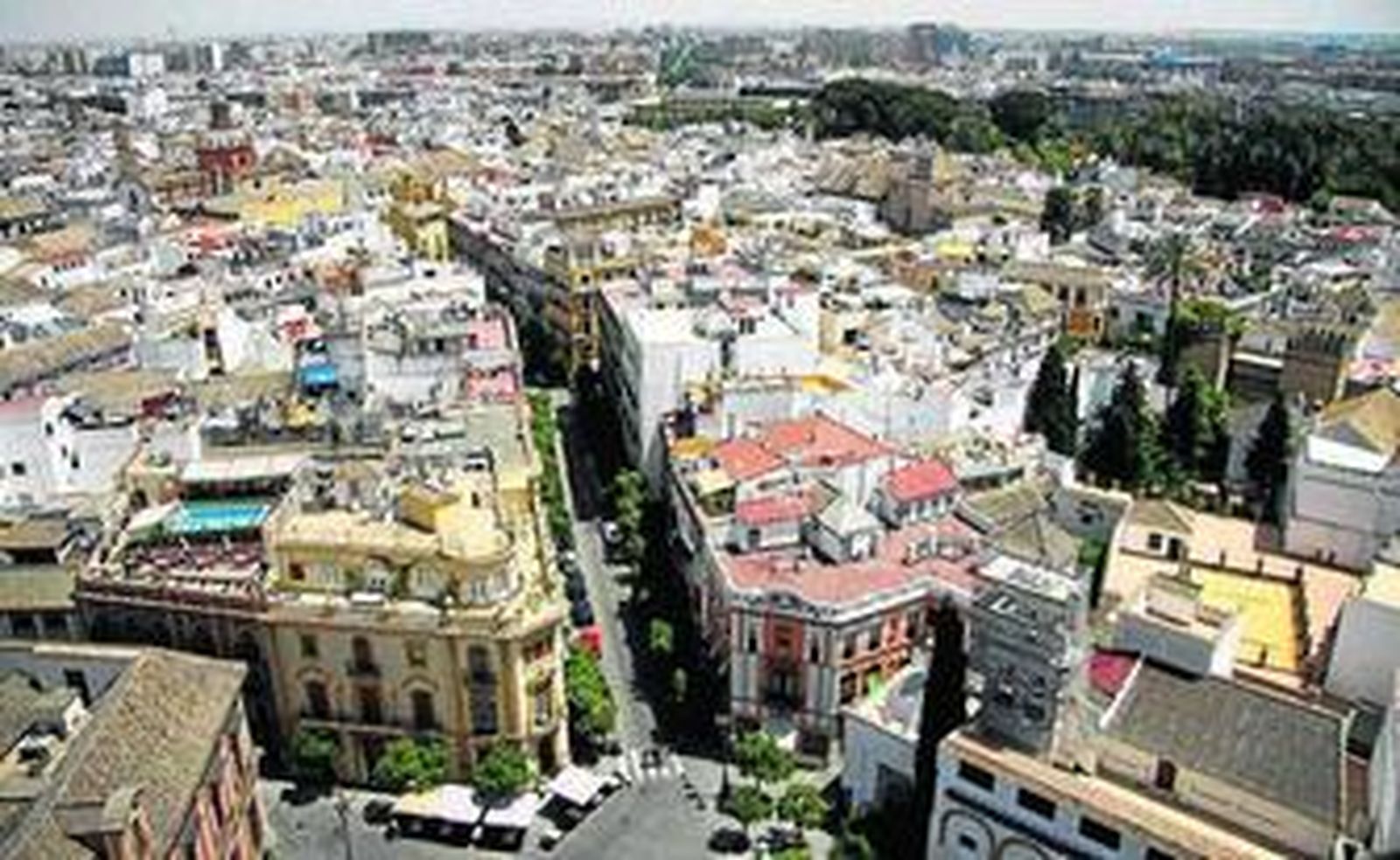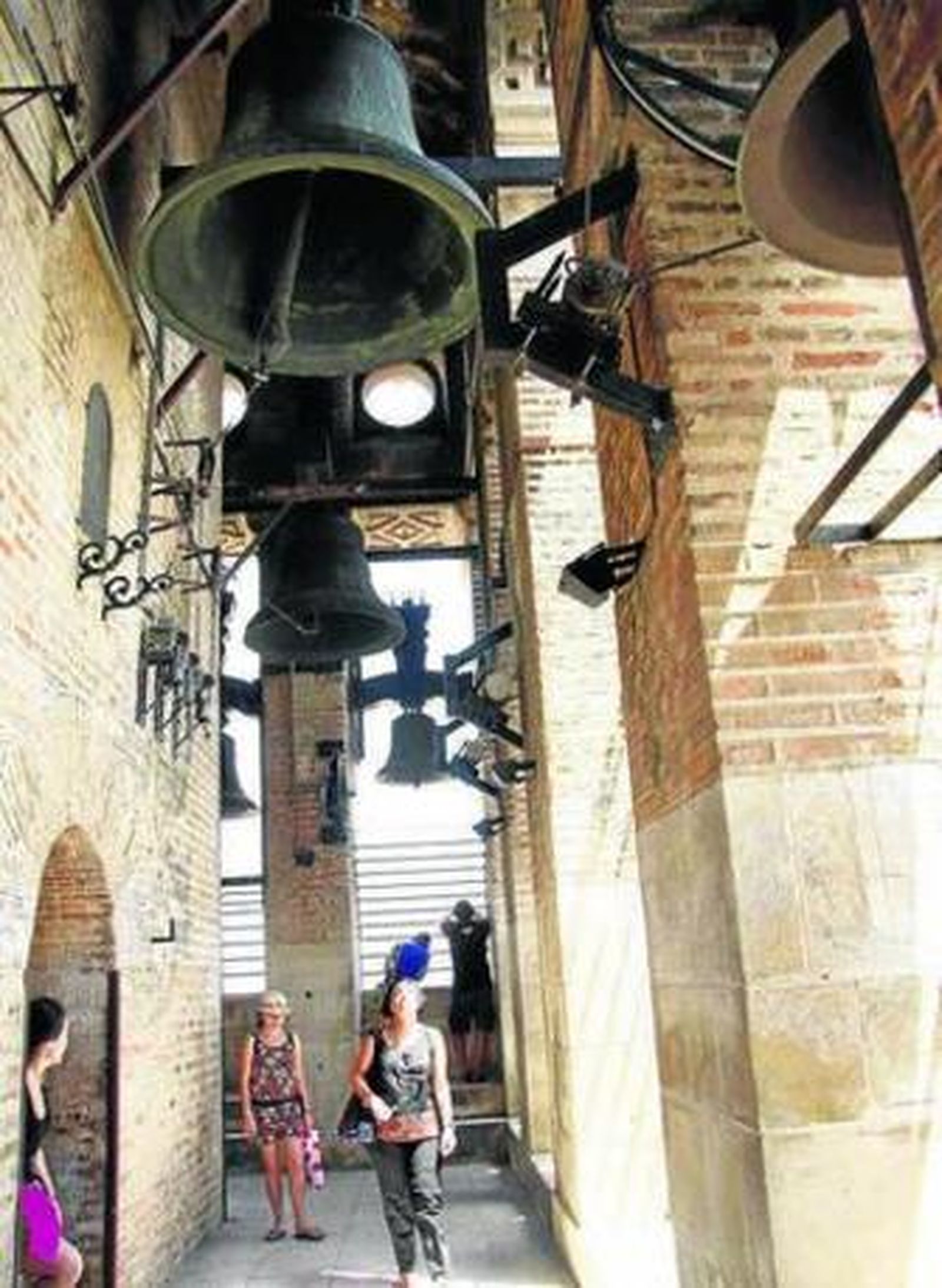 Una alemana de Fráncfort (Laura, 20 años), dos checas de Praga (Katherine, 24 años, Hanna, 22) y un finlandés (Stefan, 24). Están en El Palo (Málaga), dando un curso de español, y han aprovechado para hacer turismo en Sevilla. Les acongoja en lo alto de la torre el estruendo de las campanadas de las tres. Vienen de tierras frías y cerveceras y hacen un alto en el cuadrilátero superior desde el que se ve una ciudad que se ha ido en los Amarillos buscando las playas del litoral. Se oyen los aires acondicionados, se ve el azul turquesa de las piscinas de los hoteles Doña María, Los Seises y EM.