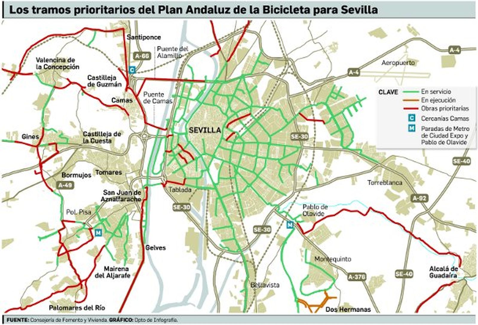 En declaraciones a este periódico, el viceconsejero de Fomento José García Cebrián aseguró que los primeros tramos de esa red ciclista metropolitana se iniciarán y culminarán en 2014. Para esta fecha estarán listas las conexiones de Sevilla con la estación de Cercanías de Camas y con la del Metro de Mairena del Aljarafe, así como el nuevo puente sobre la SE-30 a la altura de Tablada que los ciclistas de San Juan llevan décadas reivindicando para cruzar sin riesgos cuando salen del Puente de Hierro.