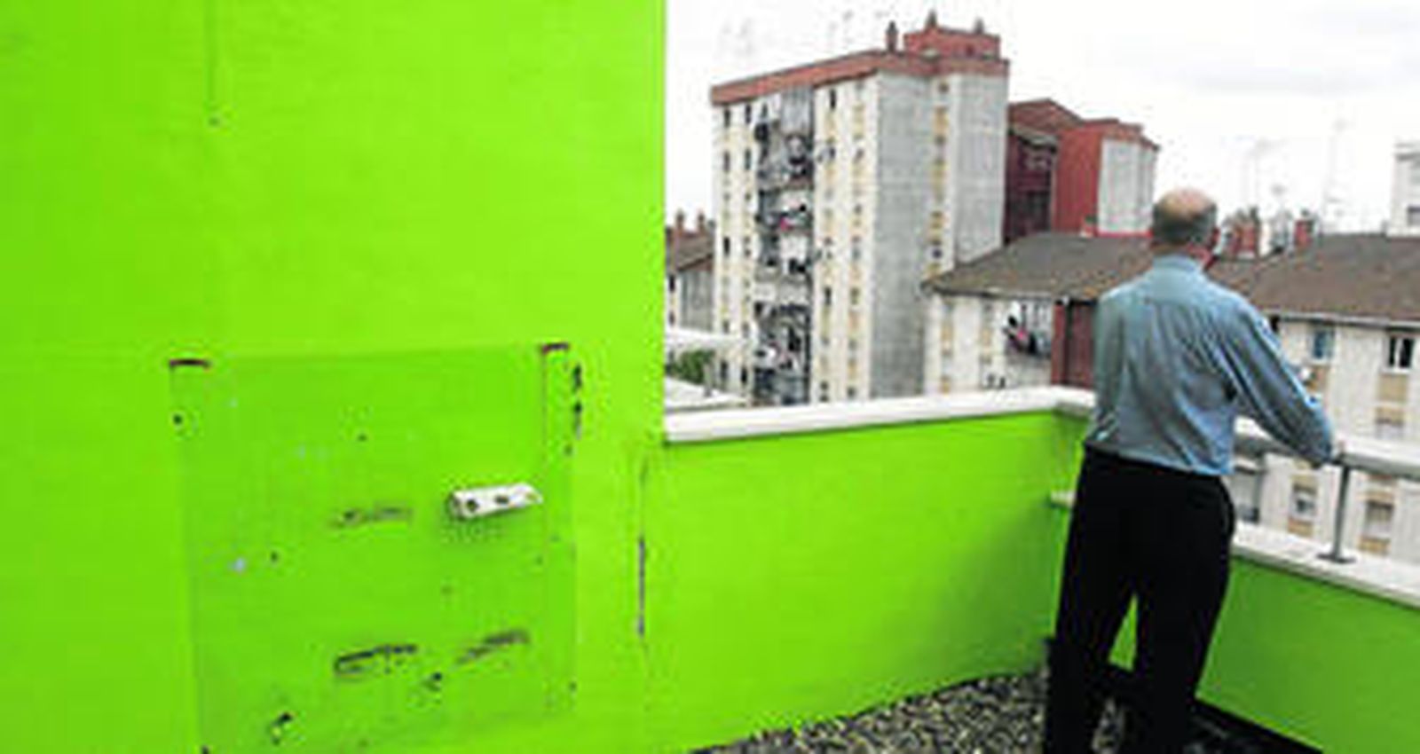 El presidente de la asociación de vecinos Martínez Montañés, Rafael Pertegal, se asoma a la azotea de uno de los bloques nuevos, donde se aprecia el robo de la instalación del gas.