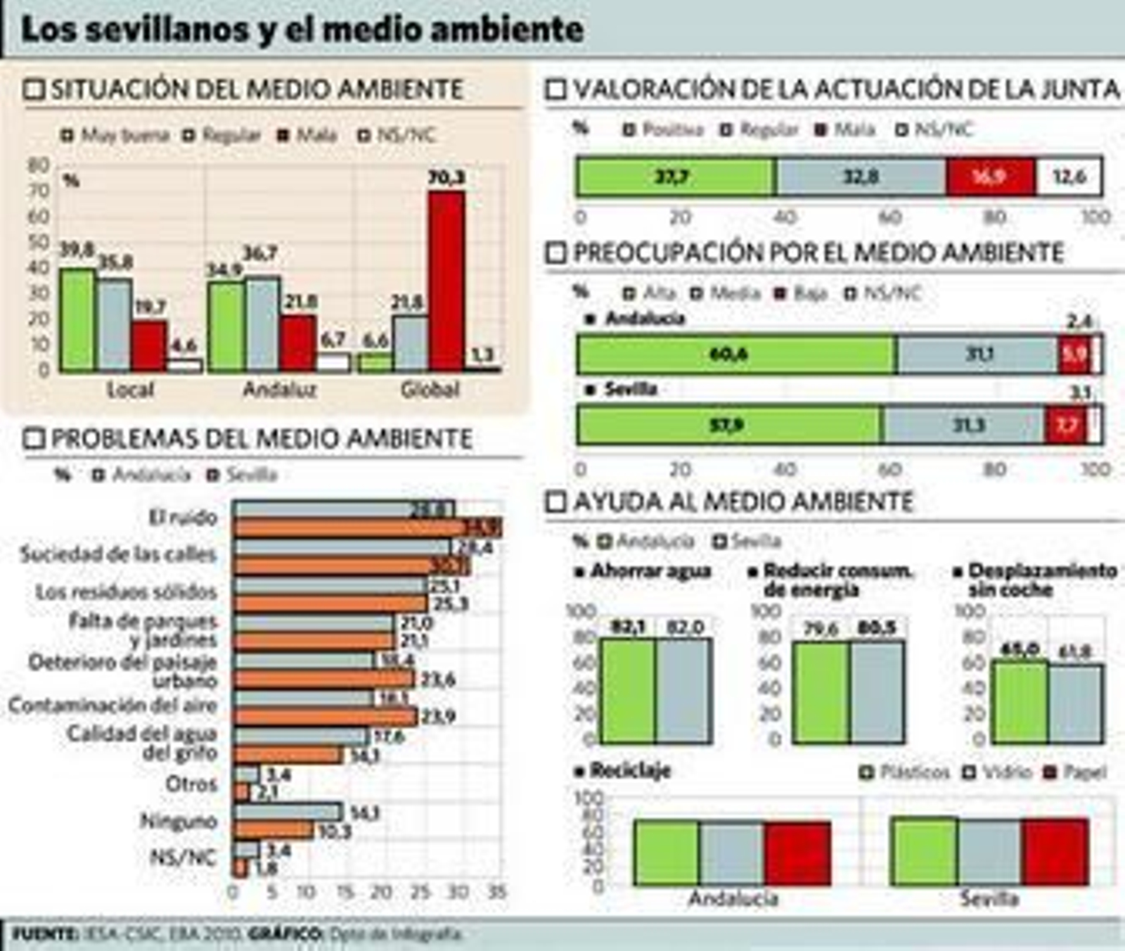 Otro dato destacable es que los ciudadanos tienen una mejor percepción de la situación del medio ambiente en su ámbito más cercano que en el contexto global. Un 70,3% de los sevillanos consideran como mala o muy mala la situación en el escenario mundial. Por contra, las valoraciones referidas al ámbito local suelen ser favorables: un 39,8% de los encuestados consideran que la situación se su localidad es muy buena o buena, frente a un 19,7% que opinan que es mala o muy mala. Los sevillanos mantienen una opinión positiva sobre la labor que desarrolla la Junta de Andalucía en materia medioambiental.