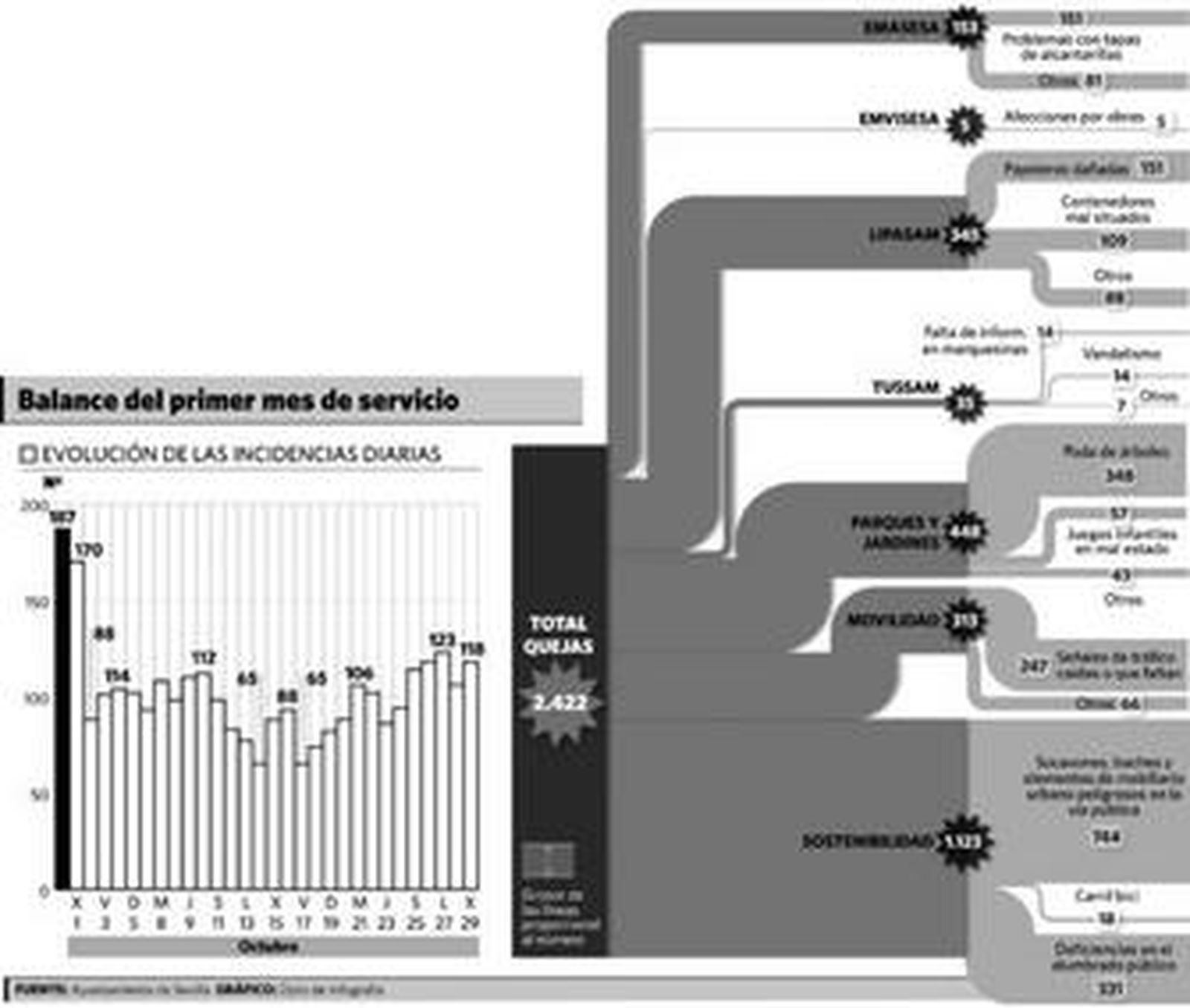 Casi 2.500 incidencias ciudadanas atendidas y solucionadas en su primer mes de funcionamiento. Ése es el (exitoso) balance del servicio municipal de Respuesta Inmediata en el Entorno Urbano (072 REUR) que el Ayuntamiento de Sevilla puso en marcha en septiembre en cumplimiento del compromiso adquirido tras las elecciones municipales de 2007. Entonces, PSOE e IU volcaron sobre el pacto de gobierno la promesa de crear unas brigadas especiales que solucionaran los pequeños desperfectos en la vía pública denunciados por los vecinos, un servicio que ha estado operativo este verano en modo de ensayo y que tras el boom inicial de llamadas atiende ahora una media de entre 100 y 120 reclamaciones diarias de arreglos. La Agrupación de Interés Económico del Ayuntamiento que aglutina las empresas municipales (AIE) es la responsable de la gestión del servicio.