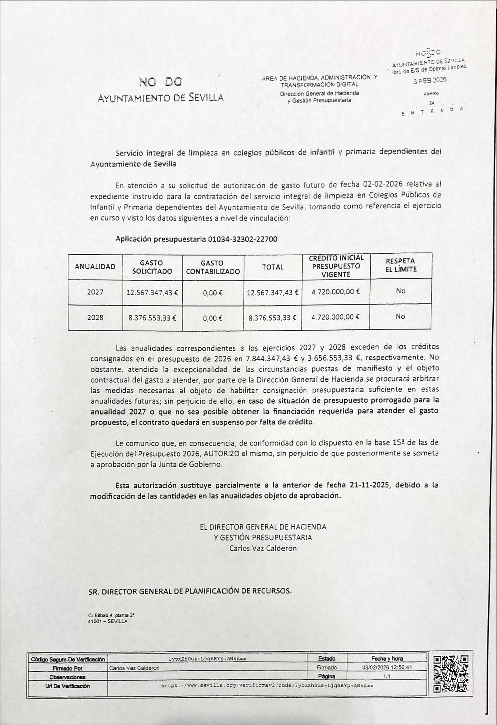El problema de este contrato que se va a licitar es que el área de Hacienda ha avisado a alcalde de que para 2027 y 2028 "las anualidades exceden los créditos consignados en el presupuesto de 2026 en 7,8 y 3,6 millones de euros respectivamente" y que "el contrato quedará en suspenso por falta de crédito" si se da una situación de presupuesto municipal prorrogado para 2027 o no es posible obtener la financiación requerida para atender el gasto propuesto. Bajo estas líneas reproducimos el documento de Hacienda.