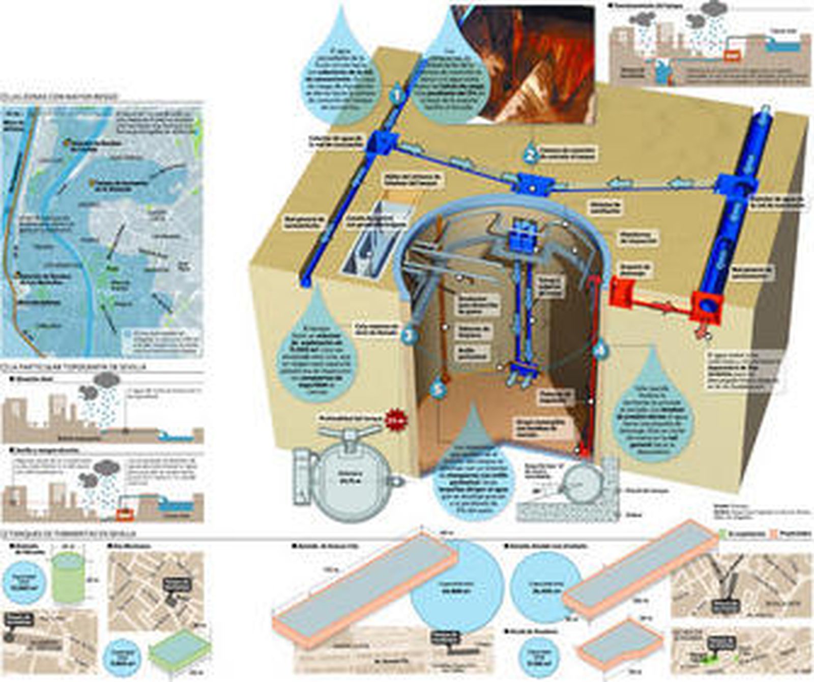 El tanque de tormentas es una obra espectacular que resulta clave para evitar situaciones de colapso en la red de alcantarillado. Está ubicado en plena Alameda, lugar precisamente de estampas pretéritas en las que se aprecia a sevillanos navegando en barca por el efecto de los históricos desbordamientos del río. Este tanque se ha construido aprovechando una de las estaciones del antiguo trazado del Metro, que en principio iba a ser cegado con relleno de hormigón en una operación valorada en 2 millones de euros, pero Emasesa apostó por negociar con la Gerencia de Urbanismo la cesión de esta infraestructura para su reconversión en tanque de tormenta. Y así fue. Su construcción de nueva factura hubiera costado 4 millones. El aprovechamiento de la antigua boca de Metro ha supuesto un ahorro de dos millones para las arcas municipales.