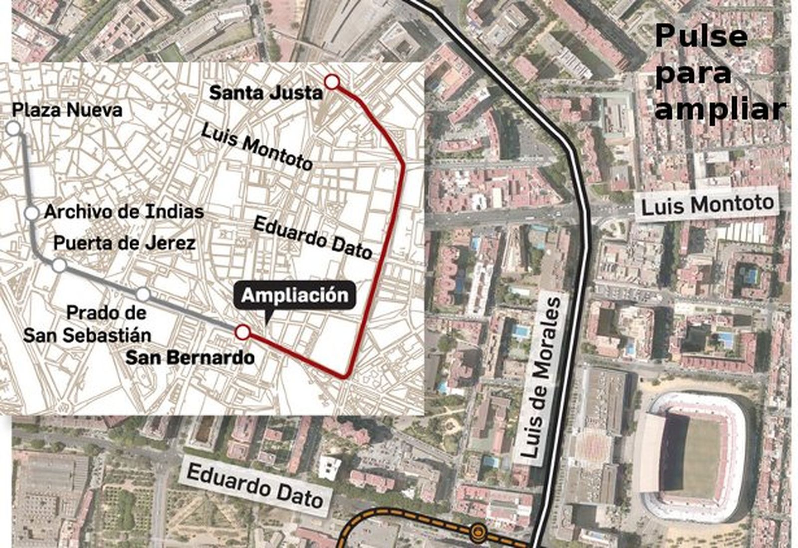 Espadas prefiere llevarlo por San Francisco Javier y Luis de Morales por la demanda de viajeros que generan esta zona y Nervión Plaza. Irá por la mediana para no afectar al tráfico.