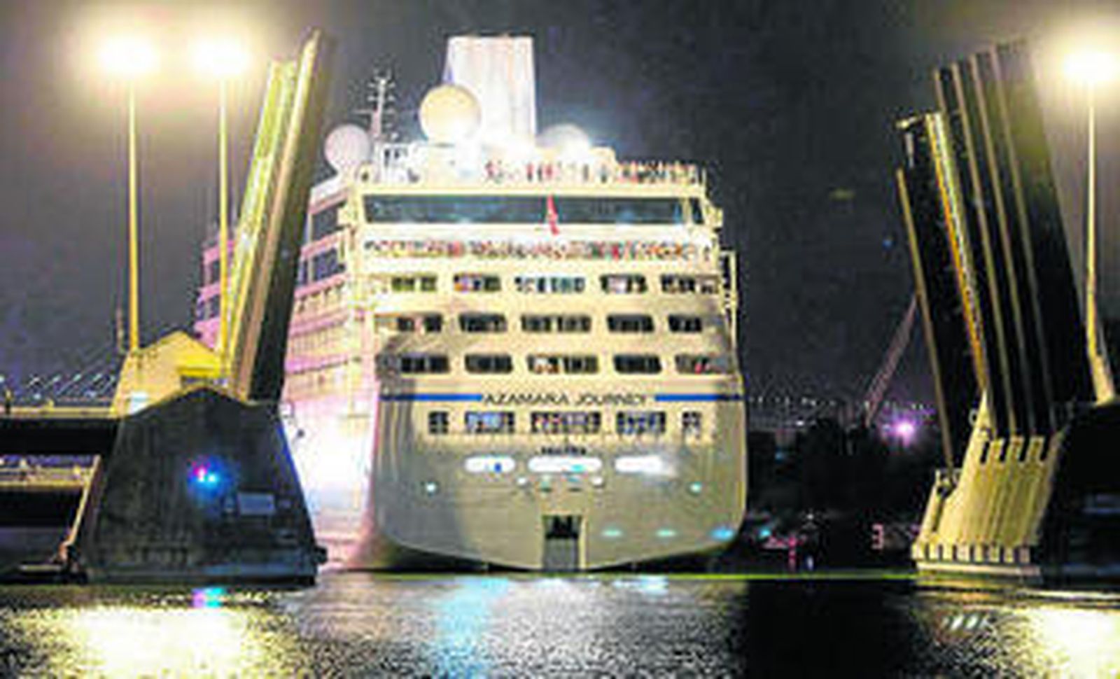 La operación tuvo dos hitos interesantes para salvar las enormes dimensiones de la embarcación de 180 metros de eslora (longitud) y 28 metros de manga (anchura): virarla para que entrara de popa en el muelle urbano a la altura de la Dársena del Batán y ayudar con un remolcador de apoyo el estrecho paso que deja al abrirse el doble puente móvil de las Delicias.