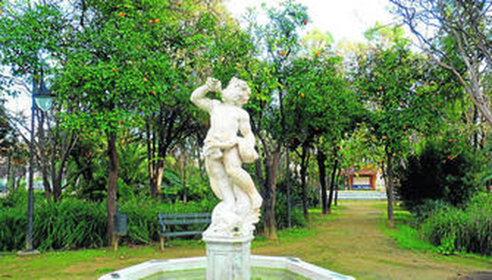 Ante nosotros se abre un hermoso paseo de paraísos (melia azedarach) donde confluyen caminos, a los lados arriates y una plataforma escalonada con pedestales y jarrones y al fondo una glorieta con una fuente. Disposiciones de caminos y paseos que nos hacen imaginar una visita diferente. Vamos hacia la izquierda donde los caminos se van rompiendo en glorietas rodeadas de naranjos morunos de hojas de mirto (citrus mirtifolia) o de falsos pomelos (citrus grandis), otras con esculturas sobre pedestales como la del dios Pan o el busto del pintor Sorolla; más allá un arbusto de buganvilla cubre un banco de hierro que la rodea.