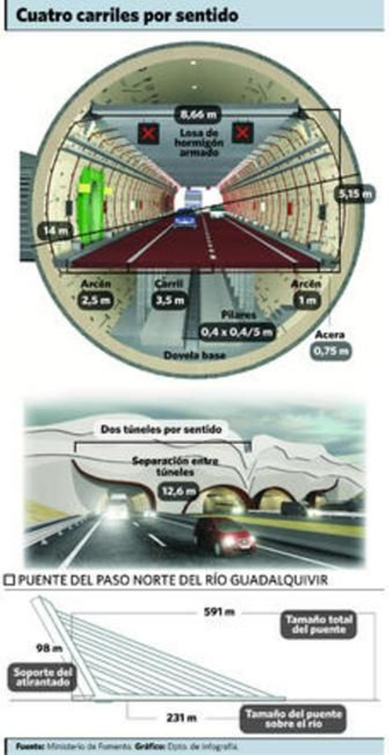 Cuatro túneles de 2,2 kilómetros de longitud, con dos carriles cada uno bajo el Guadalquivir para unir Dos Hermanas y Coria del Río, y un puente similar al del Alamillo a la altura de La Algaba y La Rinconada, con un mástil de 98 metros que soportará mediante tirantes de acero una estructura de 591 metros, serán los dos elementos más significativos de la futura SE-40, la ronda de circunvalación que recorrerá la corona metropolitana de Sevilla.