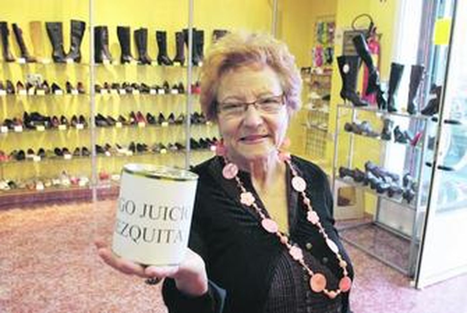 La presidenta de la asociación de vecinos Bermejales 2000 coloca huchas en distintos comercios del barrio para pagar la deuda del litigio contra la mezquita