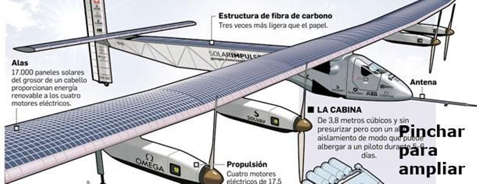 El Solar Impulse 2, según explican sus creadores, es un verdadero "laboratorio volante". Un avión monoplaza realizado en fibra de carbono, con 72 metros de envergadura -mayor que un Boeing 747- y con un peso de 2.300 kilos, lo que equivale a un coche familiar en vacío. El avión es capaz de mantener una velocidad de travesía de entre 45 y 55 kilómetros por hora, y puede alcanzar un máximo de 8.500 metros de altura.