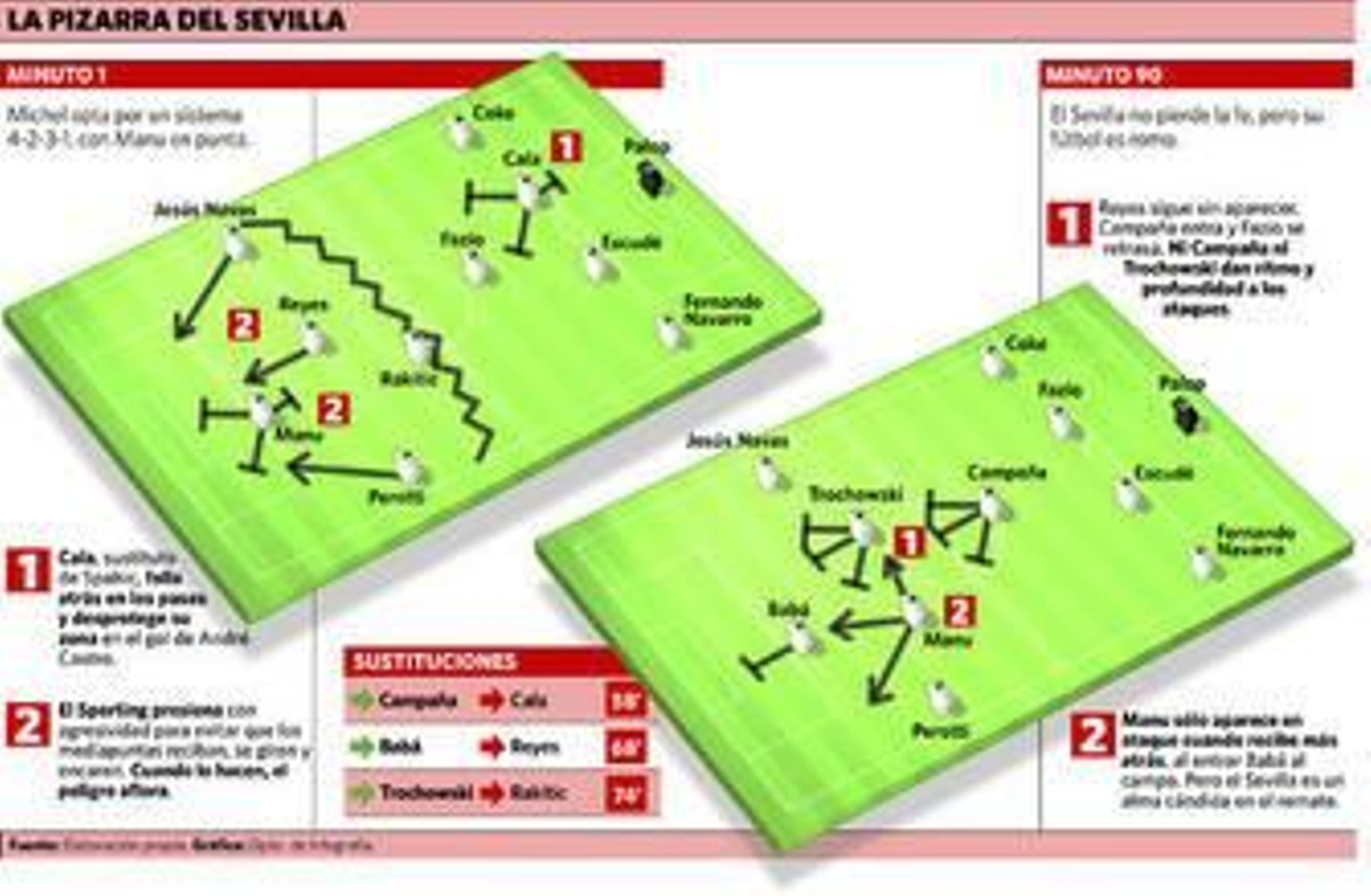 Empezó el partido con el Sporting dándole el balón al Sevilla, pero ocurrió lo que tantas veces le sucede a este Sevilla blandito y feble en el medio -sin Medel, más-, que la propia inercia del juego acaba dándole el balón al contrincante a poco que apriete la salida del balón. Cala empezó a lanzar pelotazos destemplados para salvar la línea de presión de los sportinguistas, pero Manu no es Kanoute a la hora de ganar los balones largos, Reyes tampoco es un jabato para pelear los rechaces de esos balones largos y abrir a una banda y otra... y las acometidas sevillistas fueron discontinuas.