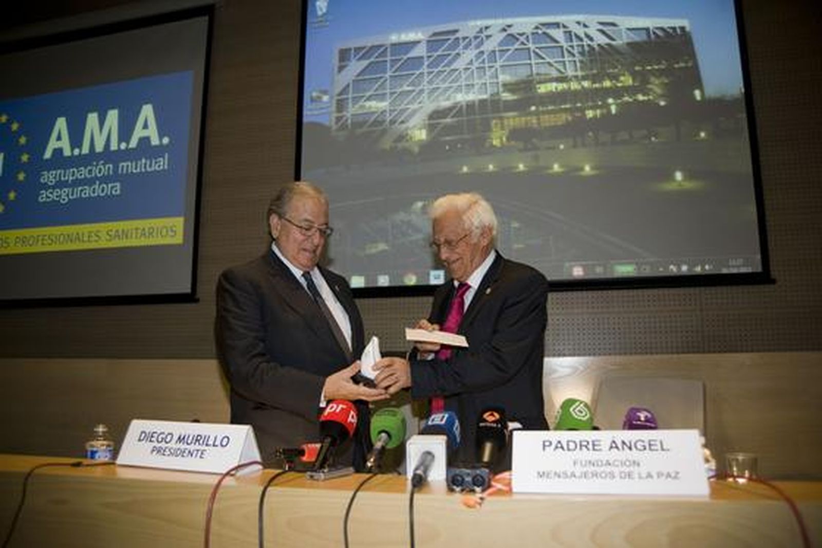 La entrega del donativo ha tenido lugar en la sede de AMA, en una rueda de prensa en la que intervinieron el padre Ángel y el doctor Diego Murillo, presidente de AMA, única compañía nacional especializada en seguros para el colectivo sanitario. La aseguradora donó el millón de euros en una cuenta abierta de la Fundación Mensajeros de la Paz, a la que pueden sumarse cuantas empresas y particulares deseen colaborar a través de esta ONG.