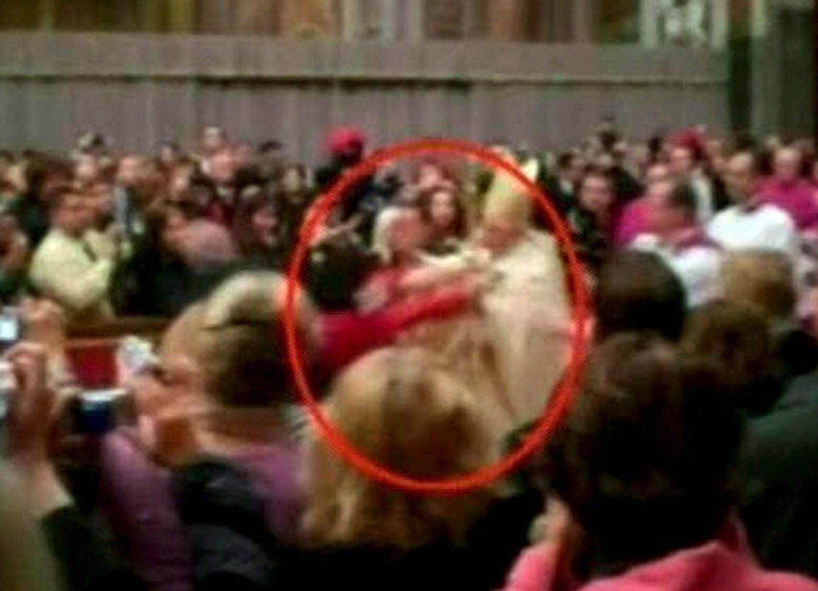El Papa Benedicto XVI cayó al suelo anoche tras recibir un empujón cuando una mujer intentó saltar una valla del interior de la Basílica de San Pedro, donde se celebraba la Misa del Gallo, para saludarle. El pontífice, que se levantó inmediatamente, no resultó herido y fue conducido por sus ayudantes hasta el altar para continuar oficiando la ceremonia, que este año comenzó dos horas antes para evitar que el Papa se fatigase. El incidente se produjo cuando el Obispo de Roma recorría el pasillo central del templo, al principio del tradicional rito, presidiendo la procesión de cardenales y otros religiosos que se dirigían hacia el altar mayor.