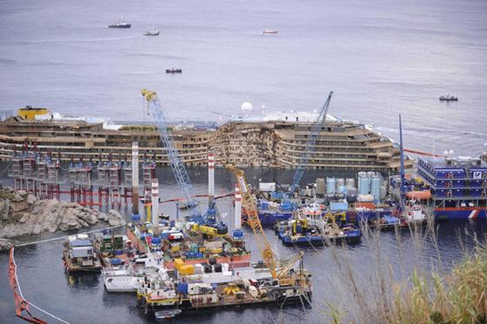 Del mar de la isla del Giglio, donde el crucero había encallado tras la maniobra del capitán Francesco Schettino, acusado ahora de homicidio y abandono del barco, resurgía la otra parte del casco, completamente deformada y abollada al haber quedado aplastada durante 20 meses contra los escollos. Durante 10 horas, una especie de gatos hidráulicos tensaron los cables de acero unidos a la parte superior de los cajones y de las plataformas instalados a babor del casco para levantarlo, mientras que otros cables, conectados a 13 torretas construidas a estribor daban equilibrio al barco. Los momentos más inciertos y que hicieron retrasar los trabajos fueron durante las primeras horas, cuando el crucero tenía que desencallar, separarse de las rocas del fondo y empezar a enderezarse.