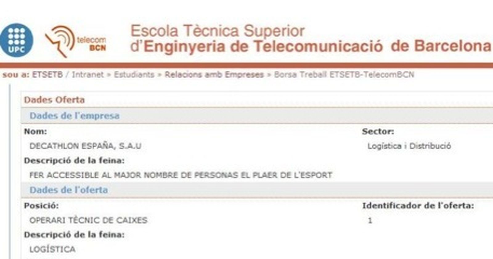 Decathlon ha publicado una oferta de trabajo en la web oficial de la Escuela Técnica Superior de Telecomunicaciones de Barcelona en la que busca "un licenciado" para cubrir la plaza de "operario técnico de cajas".