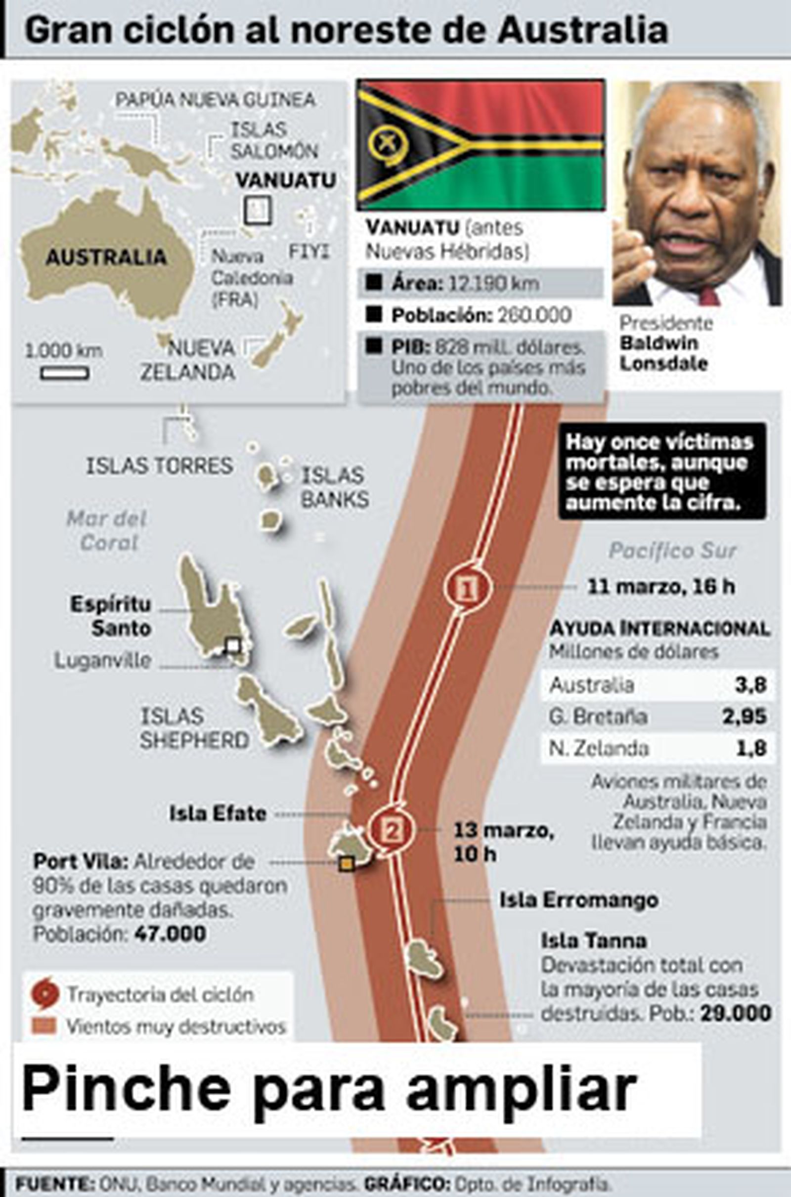 Los cooperantes siguen sin poder trasladarse a las islas más afectadas, donde viven unas 30.000 personas. Erromango está a más de 120 kilómetros al sur de la isla principal, Efate, y Tanna aún más al sur. Al parecer las islas del norte evitaron lo peor, según Alex Mathieson, de Oxfam. Esto se debe a que el ojo del ciclón, que azotó la zona al noreste de Australia en la noche del viernes pasado, pasó precisamente por la zona sur del país.