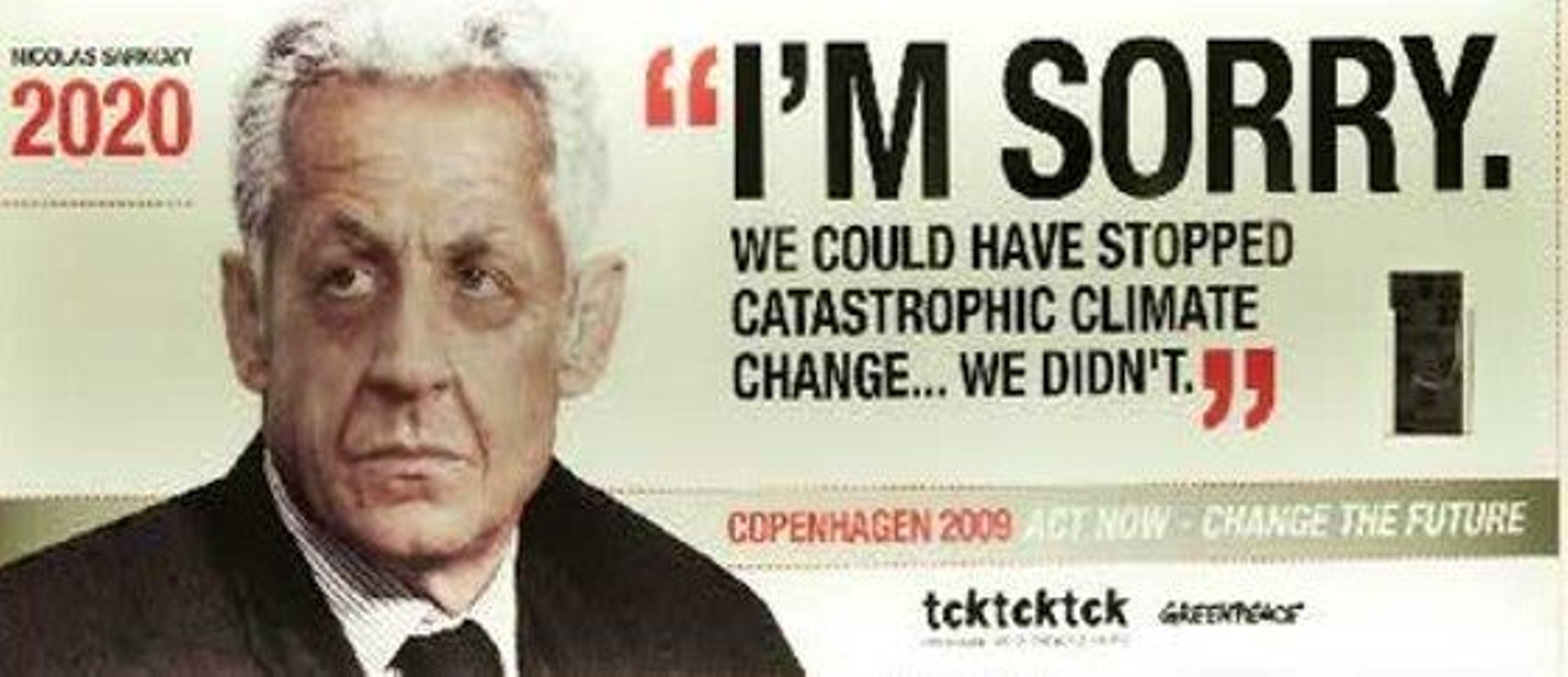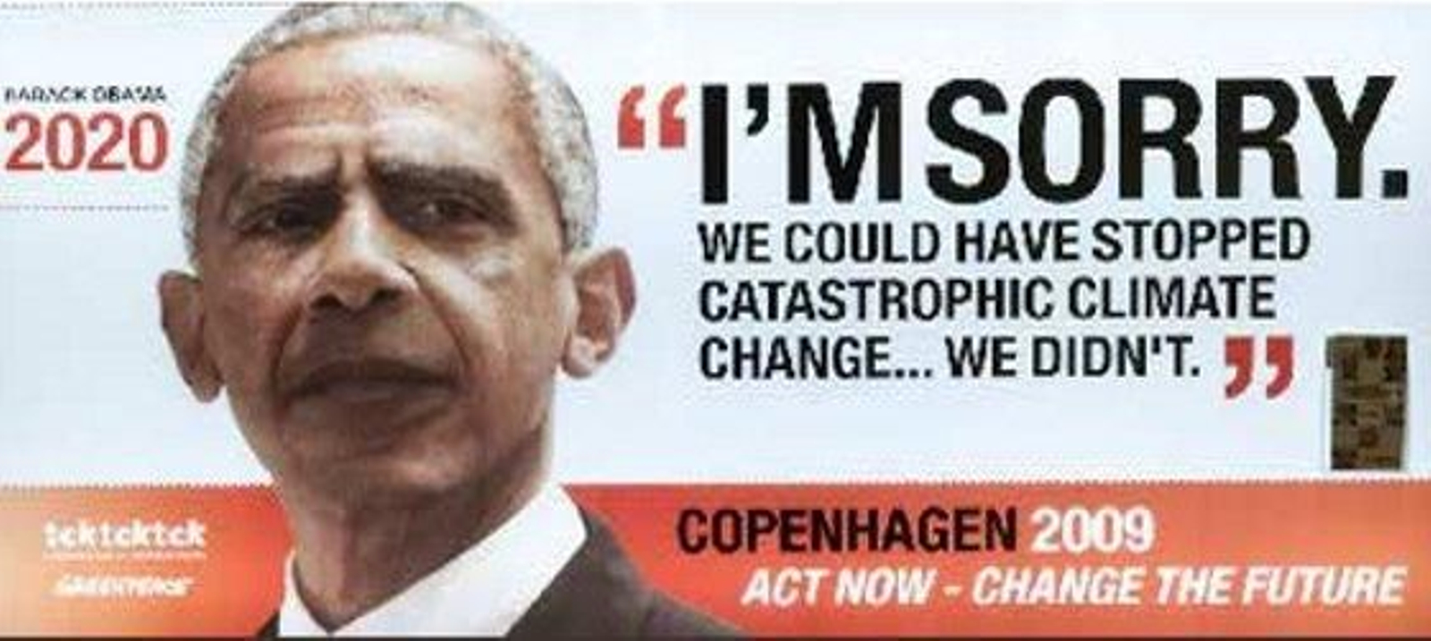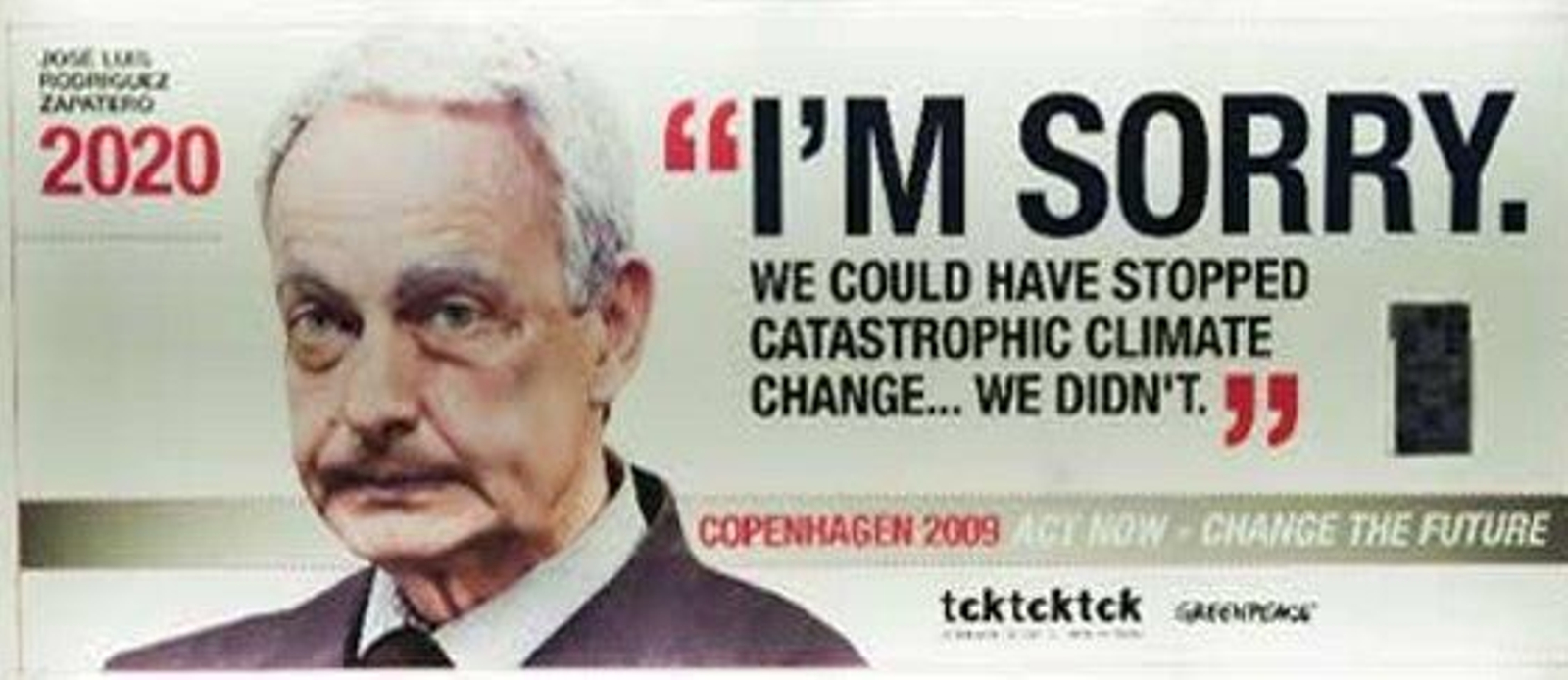 En estos paneles pueden verse imágenes de José Luis Rodríguez Zapatero, Barack Obama, Nicolas Sarkozy y otros jefes de Estado, tal y como se verían en 2020, gracias a una simulación fotográfica. Las imágenes van acompañadas de la siguiente leyenda: "Lo siento. Podríamos haber detenido un cambio climático catastrófico... pero no lo hicimos", junto al reto que lanza Greenpeace: "Actúa ahora: cambia el futuro".