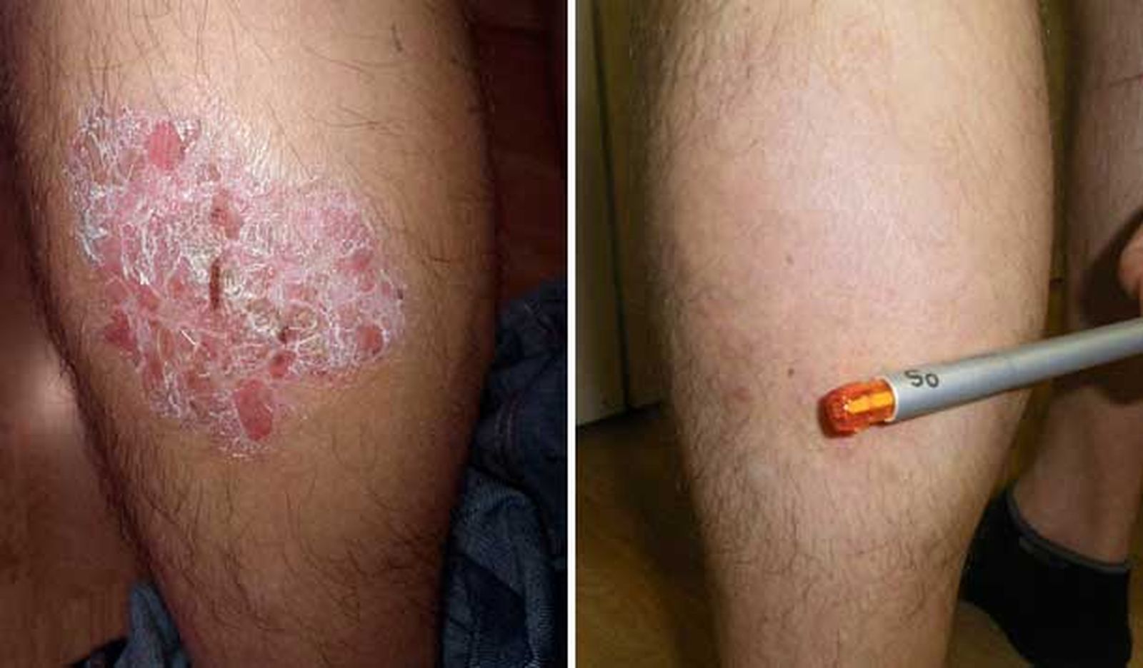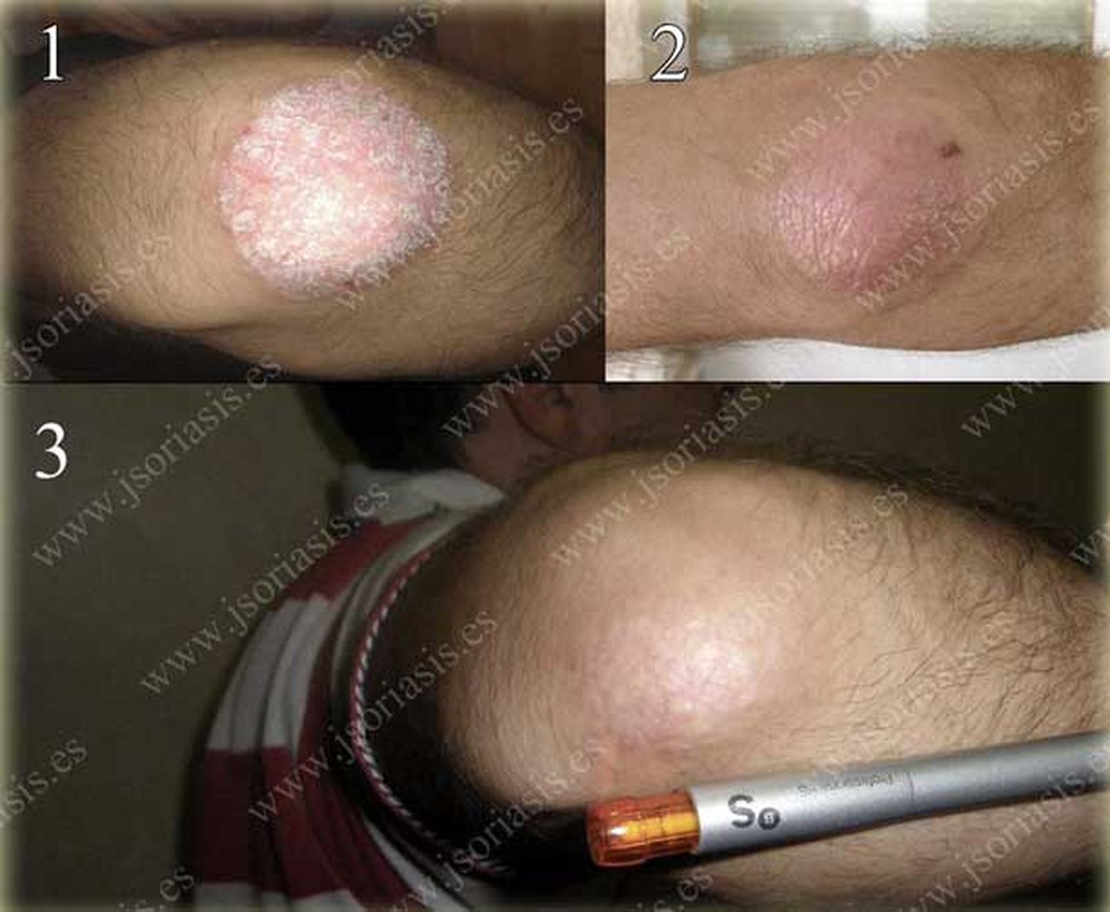 1. Psoriasis tipo placa antes de empezar el tratamiento. Se aprecia una placa escamada