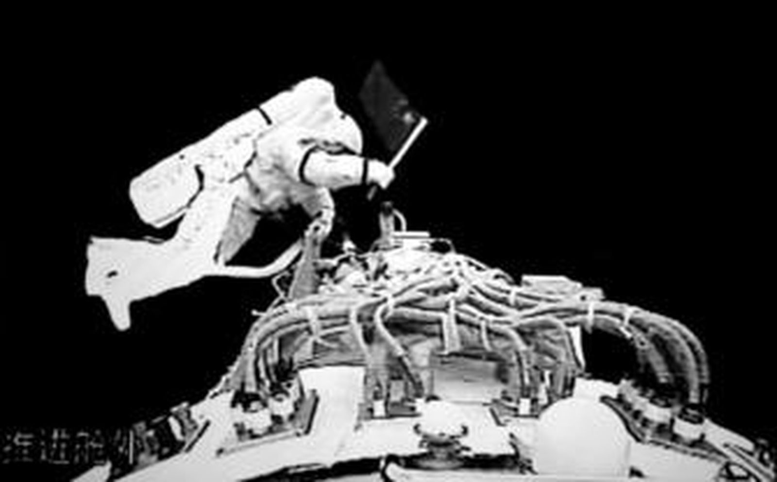 Liu Boming, otro de los tres astronautas a bordo, fue quien entregó a Zhai la enseña nacional, saliendo también al espacio exterior pero sólo parcialmente, de cintura para arriba. En los primeros instantes de la pequeña hazaña, la imagen televisada de los astronautas se perdió y hubo un minuto o dos de silencio en el centro de control pequinés, lo que creó cierta tensión entre los telespectadores, hasta que Zhai regresó a las pantallas bandera en mano.