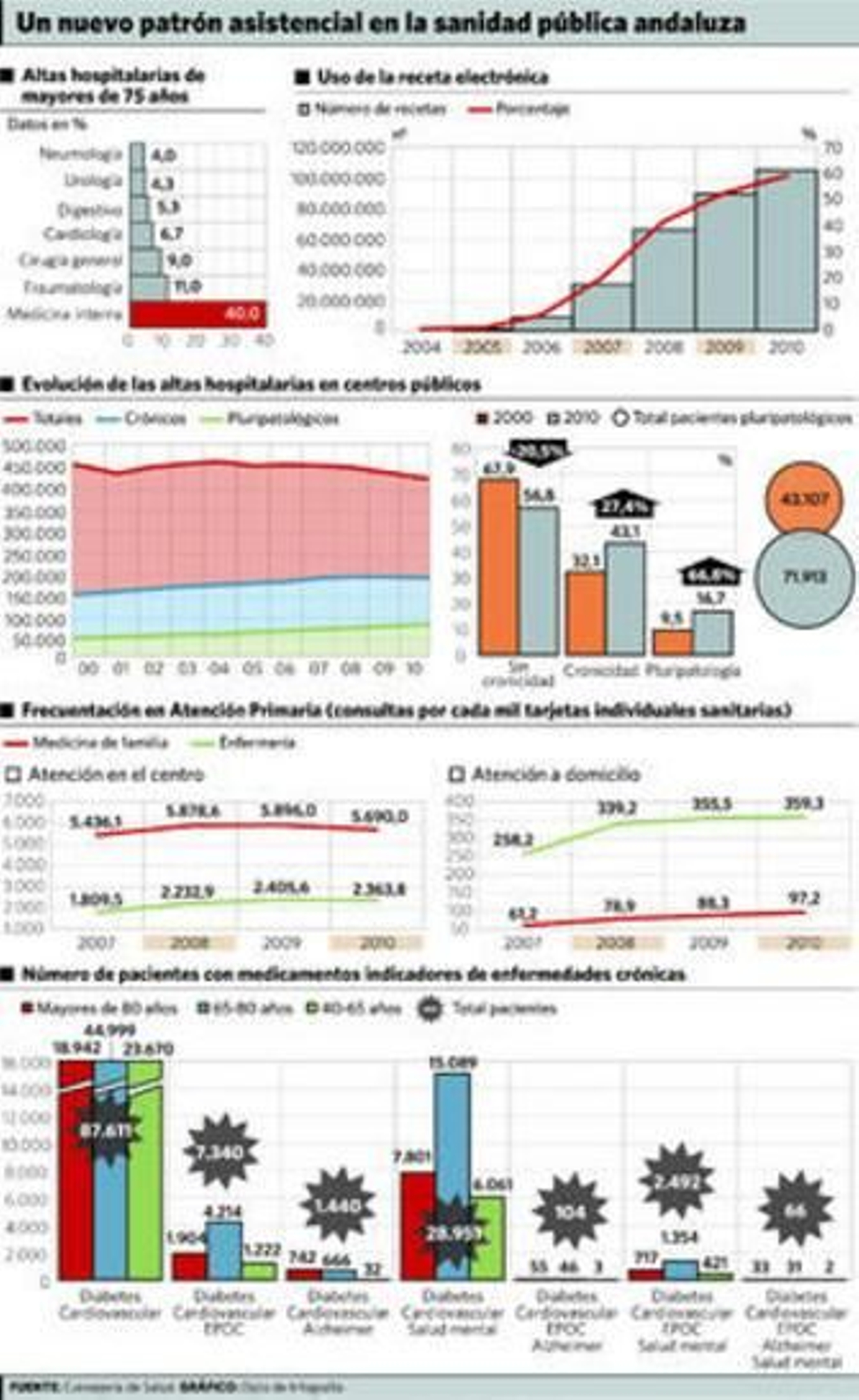 Manuel Ollero, coordinador del Plan junto a Reyes Sanz y Concepción Padilla y responsable de la Unidad de Gestión Clínica de Medicina Interna del Hospital Virgen del Rocío, explica al respecto que "nuestros hospitales de agudos se están convirtiendo en hospitales de pacientes crónicos con eventos agudos, y especialmente de pacientes con múltiples enfermedades crónicas". Eso tiene consecuencias: "Este hecho obliga a replantear la organización y las prioridades dentro del hospital", señala. Y cambiar la cultura de una organización es un desafío de enorme desgaste. Habrá resistencias al cambio: donde hay poder en juego, hay tensión. Pero, si los defensores de este esquema logran hacerse entender, la idea puede funcionar: serviría para aliviar presión de demanda inespecífica sobre otras especialidades, atender globalmente una realidad que es global (la del paciente pluripatológico y polimedicado) y trabar contactos estables y fluidos, por fin, con los centros de Atención Primaria.