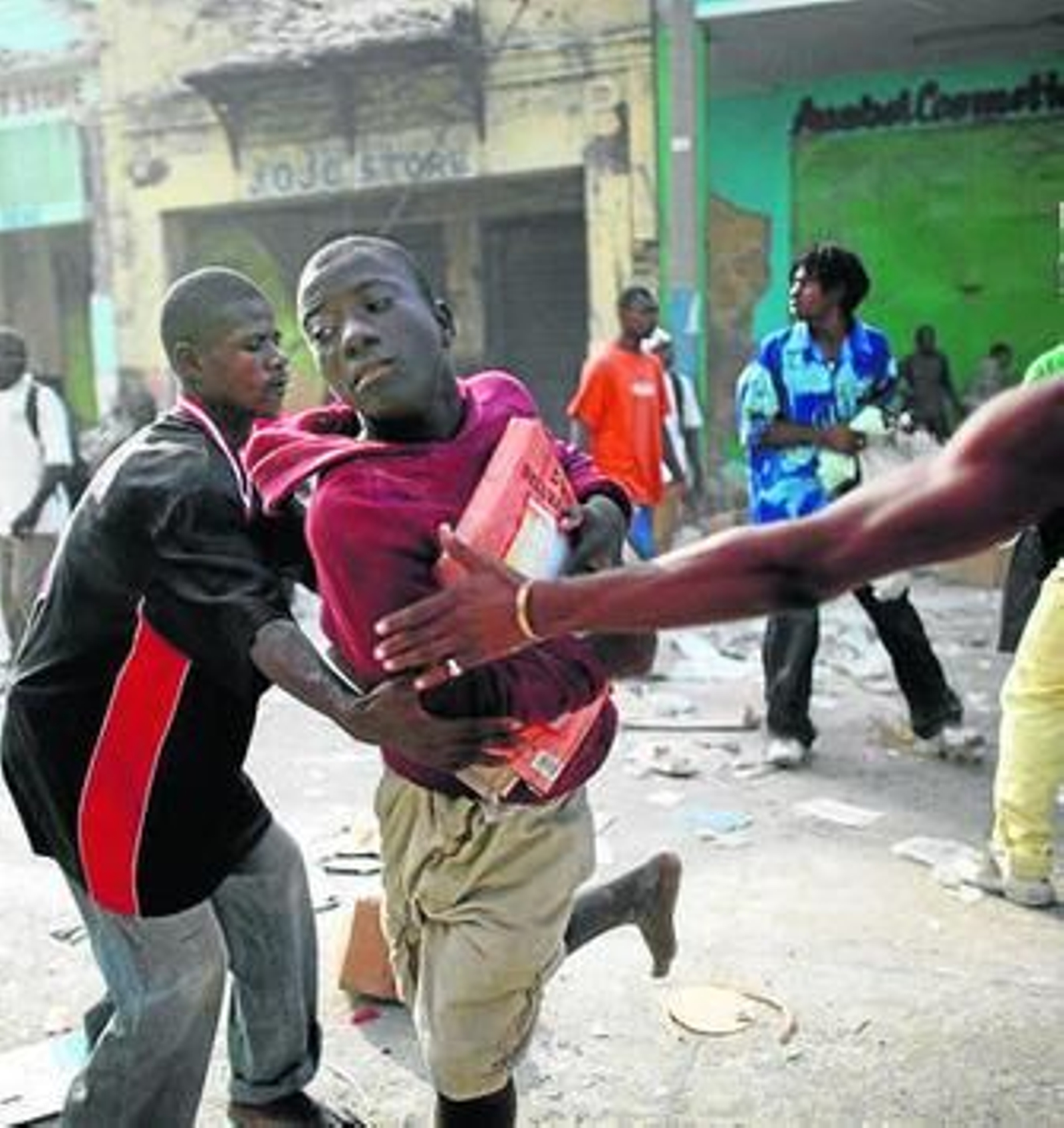 Los disparos al aire de la Policía ahuyentan sólo unos minutos al grupo de haitianos que intentan entrar en una tienda de ropa del centro de Puerto Príncipe, devastado por un terremoto que convirtió a sus ciudadanos en ladrones debido al hambre y al abandono. Desde el pasado martes, cuando el seísmo redujo buena parte de la ciudad a las ruinas, centenares de tiendas, oficinas públicas y domicilios de la capital fueron saqueados ante la impotencia de la Policía, que tiene órdenes de no disparar a una población diezmada por la tragedia.