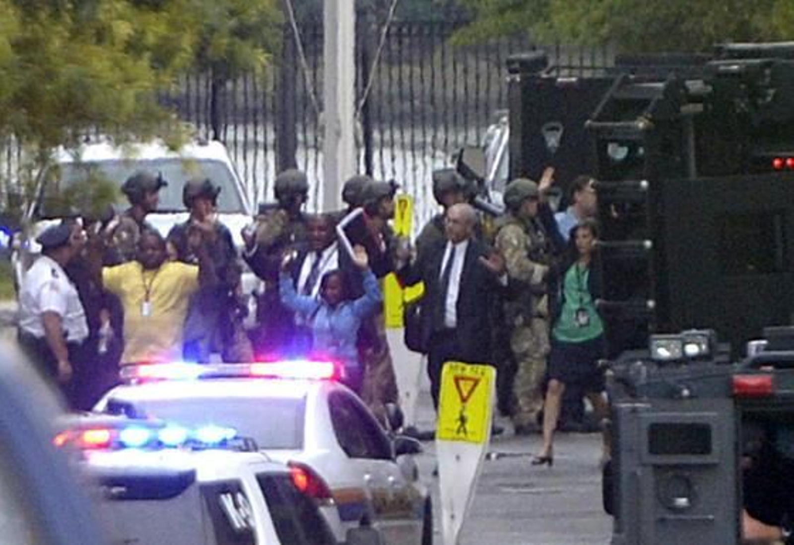 Tras varias horas de informaciones confusas sobre el número de víctimas, el alcalde de Washington, Vincent Gray, y la inspectora jefe de Policía, Cahty Lanier, ofrecieron dos ruedas de prensa para informar de los hechos. Gray confirmó que había "múltiples fallecidos" y varios heridos en lo que consideraba un hecho "aislado", al rechazar que hubiese indicios de ataque terrorista. Por su parte, Lanier dijo que el supuesto autor de los disparos fue abatido, pero añadió que "tenemos informaciones que sugieren que al menos dos individuos han sido vistos con armas de fuego". "La principal preocupación ahora es que tenemos dos potenciales autores que no hemos localizados por el momento", declaró Lanier, y agregó que se trataba de dos hombres, uno de raza blanca y otro negra, con vestimenta militar. Sin embargo, la policía metropolitana identificó poco después a la persona de raza blanca y la consideró como "no sospechosa".