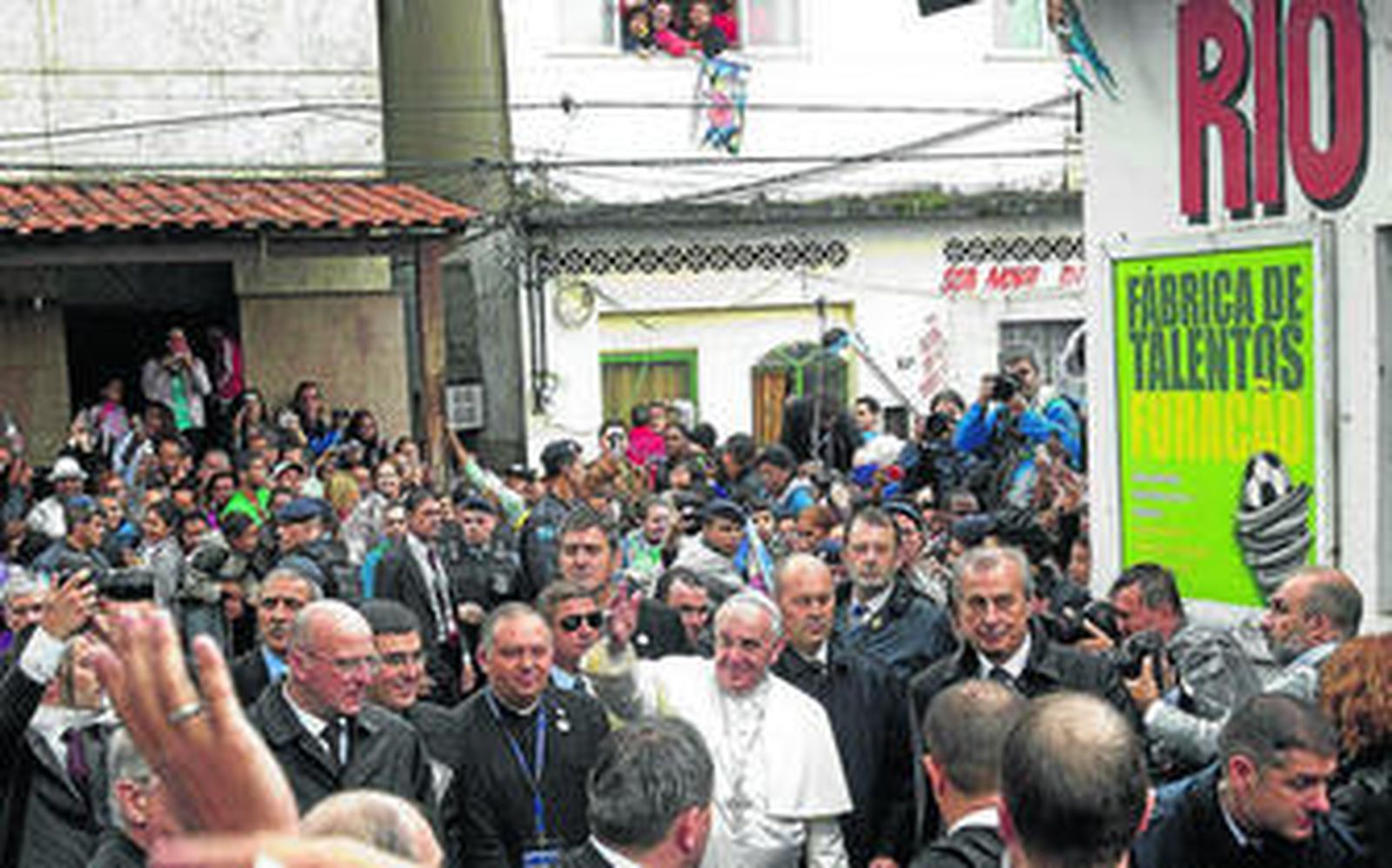 En una mañana lluviosa y fría y en medio de fuertes medidas de seguridad, con policía con armas de precisión y helicópteros, el Papa visitó el complejo de favelas de Manguinhos, en el norte de Río de Janeiro, que hasta finales del pasado año estaba controlado por narcotraficantes y ahora es una zona recuperada para la ciudad.