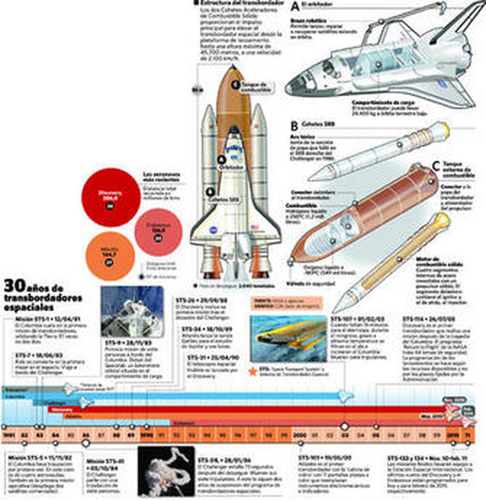 Y es que el Discovery ha hecho historia más de una vez. Fue el primero en volver a volar después de que los transbordadores Challenger y Columbia sufrieran accidentes, colocó en órbita el célebre telescopio Hubble, protagonizó el primer encuentro entre aparatos de EEUU y la estación espacial rusa MIR y voló en las primera y última misiones con transbordador para el cambio de tripulación de la Estación Espacial Internacional (ISS).