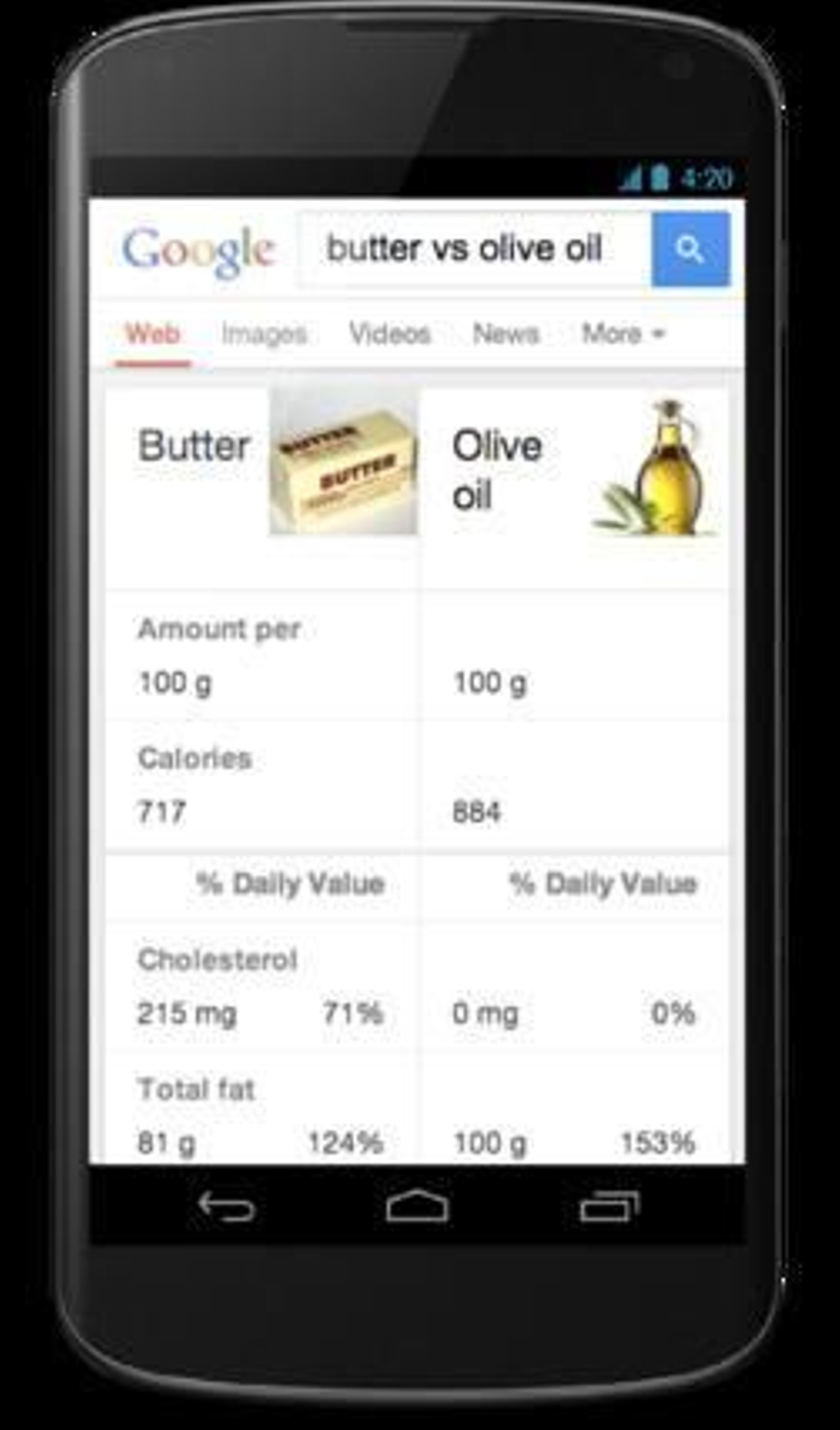 Según anuncia la compañía en el blog dedicado a su buscador, la modificación permitirá a Google responder a más preguntas, incluso a las que no tienen una respuesta simple. Por ejemplo, dicen, el usuario puede pedir al buscador que le hable de los artistas impresionistas y le mostrará quiénes son y podrá aprender sobre ellos y echar un vistazo a sus trabajos más famosos. En el caso de las comparaciones, los usuarios podrán introducir búsquedas como “comparar mantequilla con aceite de oliva” y se les mostrarán diferentes características de ambos productos.