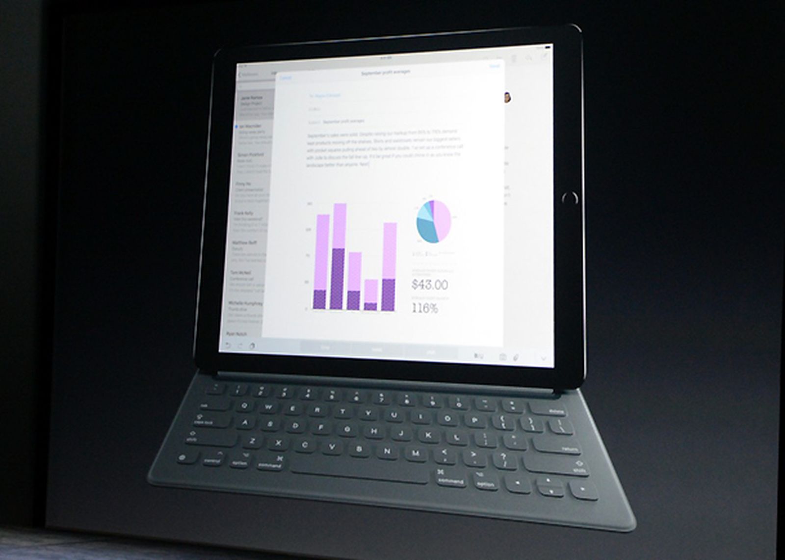 Con 12,9 pulgadas de pantalla, más potencia y resolución que sus predecesores y la posibilidad de insertarle un teclado físico (similar al de las Surfaces de Microsoft) y un stylus (bautizado como Apple Pencil, o lápiz Apple), la empresa ofrece un dispositivo más ligero y más rápido que muchos portátiles de dimensiones similares del mercado, y la posibilidad de trabajar con programas de ofimática como los incluidos en el paquete Office de Microsoft o de diseño gráfico como los que desarrolla Adobe (representantes de Microsoft y Adobe estuvieron en la presentación para probar sus aplicaciones en el dispositivo).