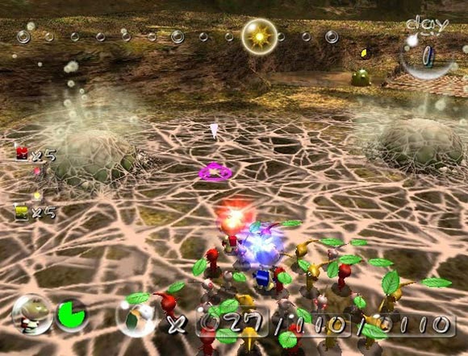 Adalid, como siempre, del entrañable pacifismo que le ha hecho leyenda, Olimar es aquí el protagonista de una trama interplanetaria que podría definirse como de anti-invasión: su llegada, acompañado del copiloto Luis, a un extraño planeta poblado por pequeñas criaturas a medio camino entre zanahoria y animal (los llamados pikmins), no trae más consecuencia que la aceptación inmediata de su liderazgo por parte de los nativos, de cara a conseguir materia prima, ya sea orgánica o inorgánica, que habremos de administrar a distintas naves nodrizas, para que ésta sea transformada en nuevas criaturas, o bien en alimentos.