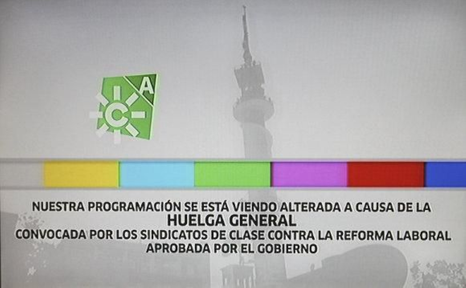 En el caso de la RTVA la autonómica andaluza no ofrece hoy sus emisiones en alta definición ni en su señal internacional, Andalucía TV, con un cartelón que anuncia en esos canales la convocatoria de huelga, de forma ininterrumpida, hasta la medianoche de hoy. Ese cartel ("Nuestra programación se está viendo alterada a causa de la huelga general convocada por los sindicatos de clase contra la reforma laboral aprobada por el gobierno") es el que estaba previsto que se mantuviera durante toda esta pasada madrugada tanto en Canal Sur como en Canal Sur 2, tras interrumpirse la señal a medianoche con un avance informativo. Buenos días Andalucía, Tiene arreglo, La tarde aquí y ahora y Andalucía Directo no está previsto que se emitan aunque la cadena haya anunciado sus entregas. Esos espacios serán ocupados por películas y documentales, como ha sucedido en anteriores convocatorias. Los informativos Noticias 1 y 2 se reducirán a veinte minutos, sin información del tiempo ni deportes. Los sindicatos aceptaron que en prime time se mantuvieran el serial Arrayán y el programa de humor Qué buen puntito.