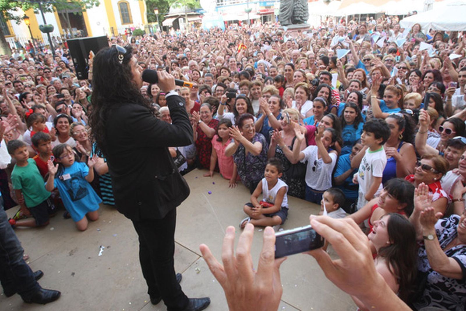 El joven, de 21 años, irrumpió en la plaza en un coche de caballos acompañado por su madre Charo, quien le ha acompañado en las galas del popular concurso. El presentador del acto, Cristóbal Barranco, logró llevar al artista hasta el pequeño escenario montado para la ocasión, donde fue recibido por el presidente de la Asociación Sociocultural Amantes de la Copla, Pepe Infante, con el que se fundió en un emotivo abrazo. Le esperaban también la alcaldesa, Gemma Araujo, y otros miembros de la Corporación municipal.