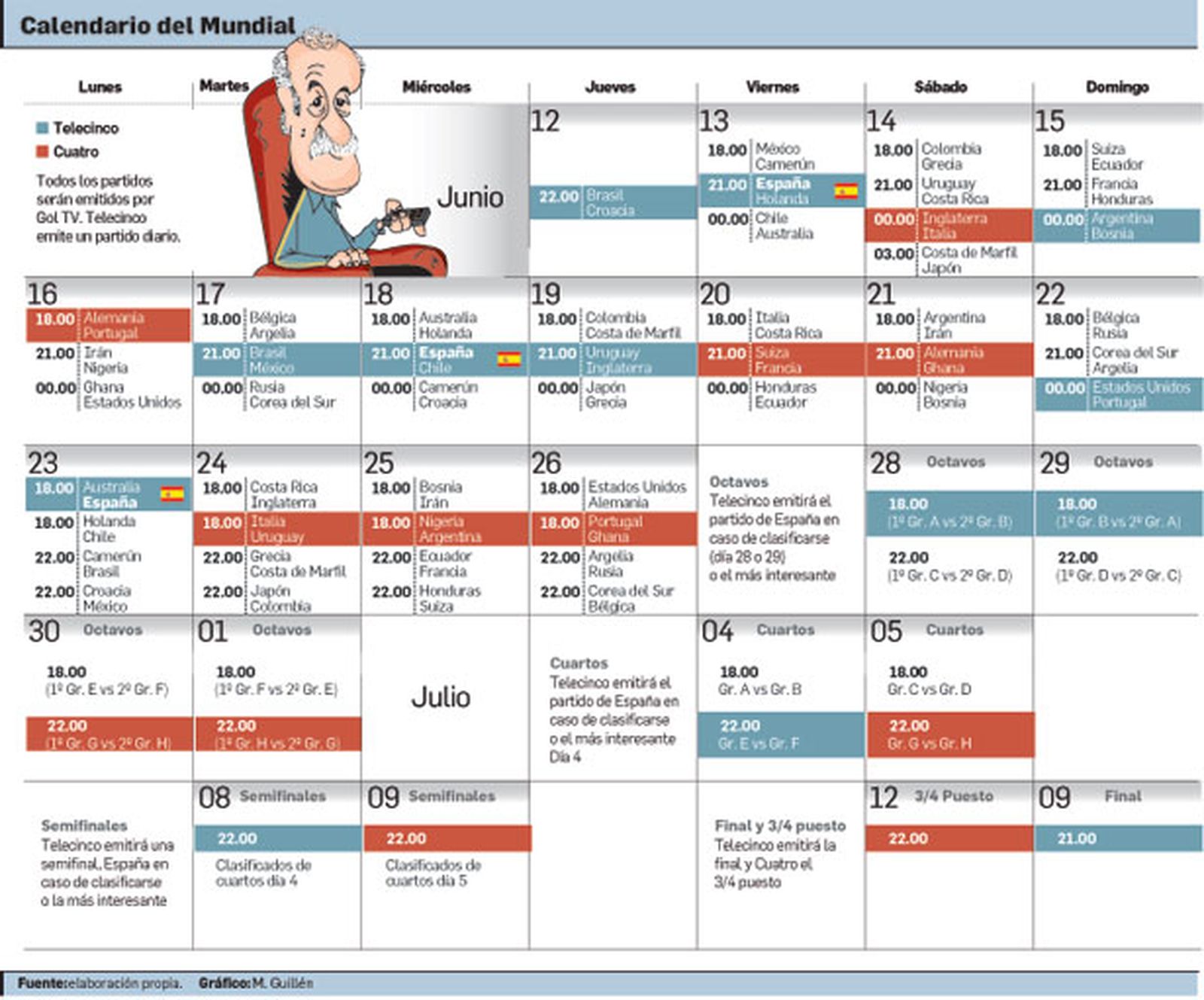 Falta menos de una semana para que arranque el Mundial de Brasil, uno de los eventos deportivos que revolucionará los audímetros de 2014. Telecinco tiene todo preparado para la cuenta atrás y esta misma tarde emitirá uno de los amistosos de La Roja antes de su primer choque en Maracaná. En total, Mediaset ofrecerá un total de 25 partidos en abierto entre los que se encuentran los que disputará la selección española (el 13, el 18 y el 23 frente a Holanda, Chile y Australia, respectivamente). Retransmitirá también uno de los partidos de octavos y uno de cuartos, así como la semifinal del campeonato (una en Cuatro y otra en Telecinco), el partido por el tercer y cuarto puesto (en Cuatro) y la final del 9 de julio. Todos partidos (tanto los que ofrezca Mediaset como los que se emitan a través del canal de pago Gol TV) se ofrecerán a las seis de la tarde, a las nueve de la noche o a las doce. Los que disputa España en la fase de grupos se ofrecerán a las seis (el día 13) y a las nueve (18 y 23).