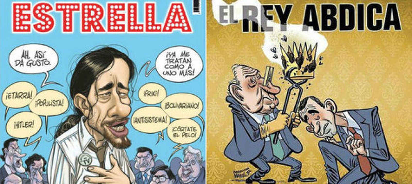 Con el título "El rey abdica", la portada retirada, obra del ex director de la revista, Manel Fontdevila, que ha dimitido, evocaba satíricamente el relevo real con una corona de la que emanaba olor.
