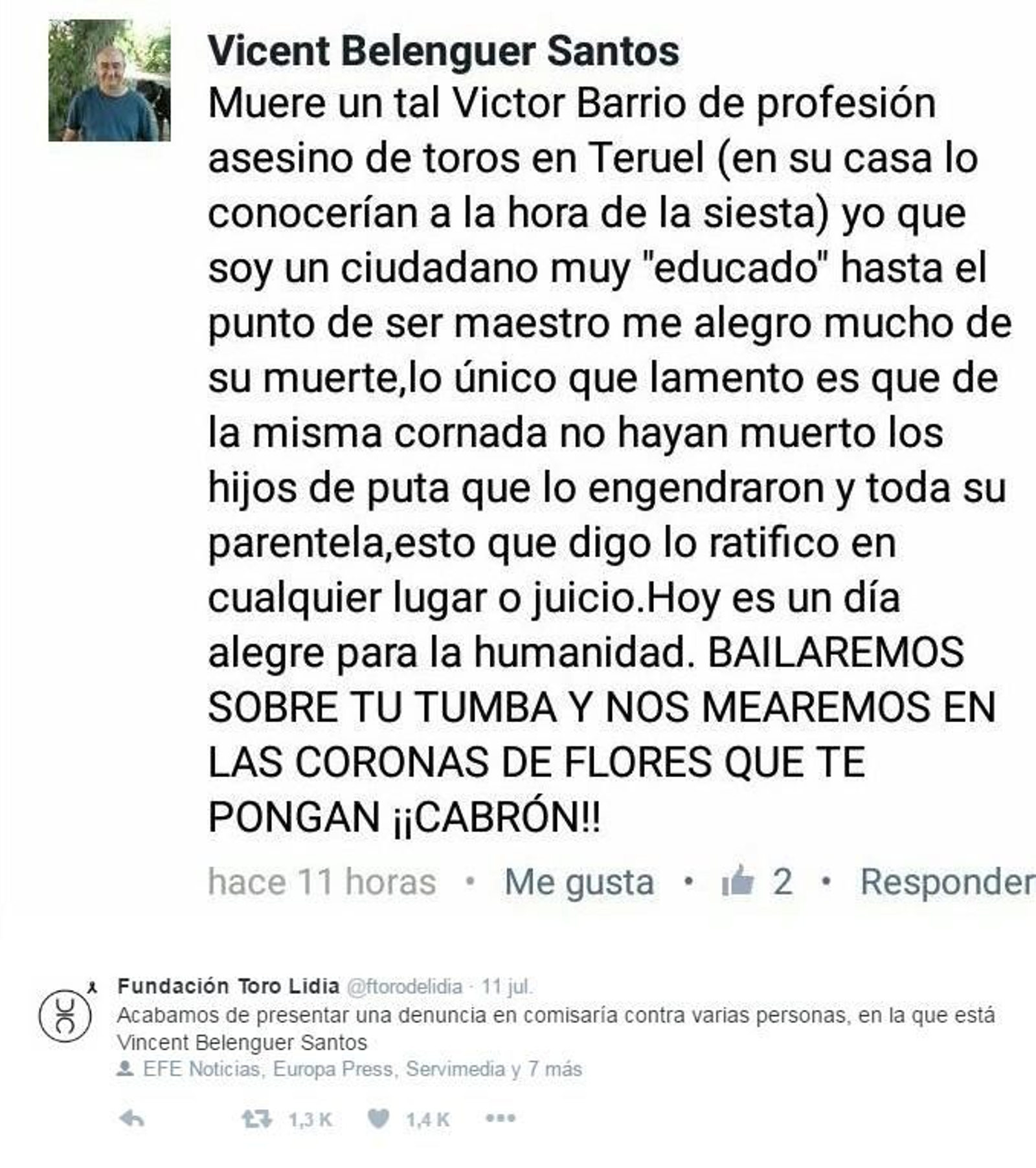 Uno de los individuos, Vicent Belenguer, que afirma en un twitter que es un maestro y se alegra de la muerte del torero hasta decir que "bailaremos y nos mearemos en las coronas que te pongan..." ya ha provocado 150.000 firmas para su inhabilitación. Otros muchos ciudadanos, perplejos, han rechazado en las mismas redes varios mensajes de un rapero que firma como Pablo Hasel.