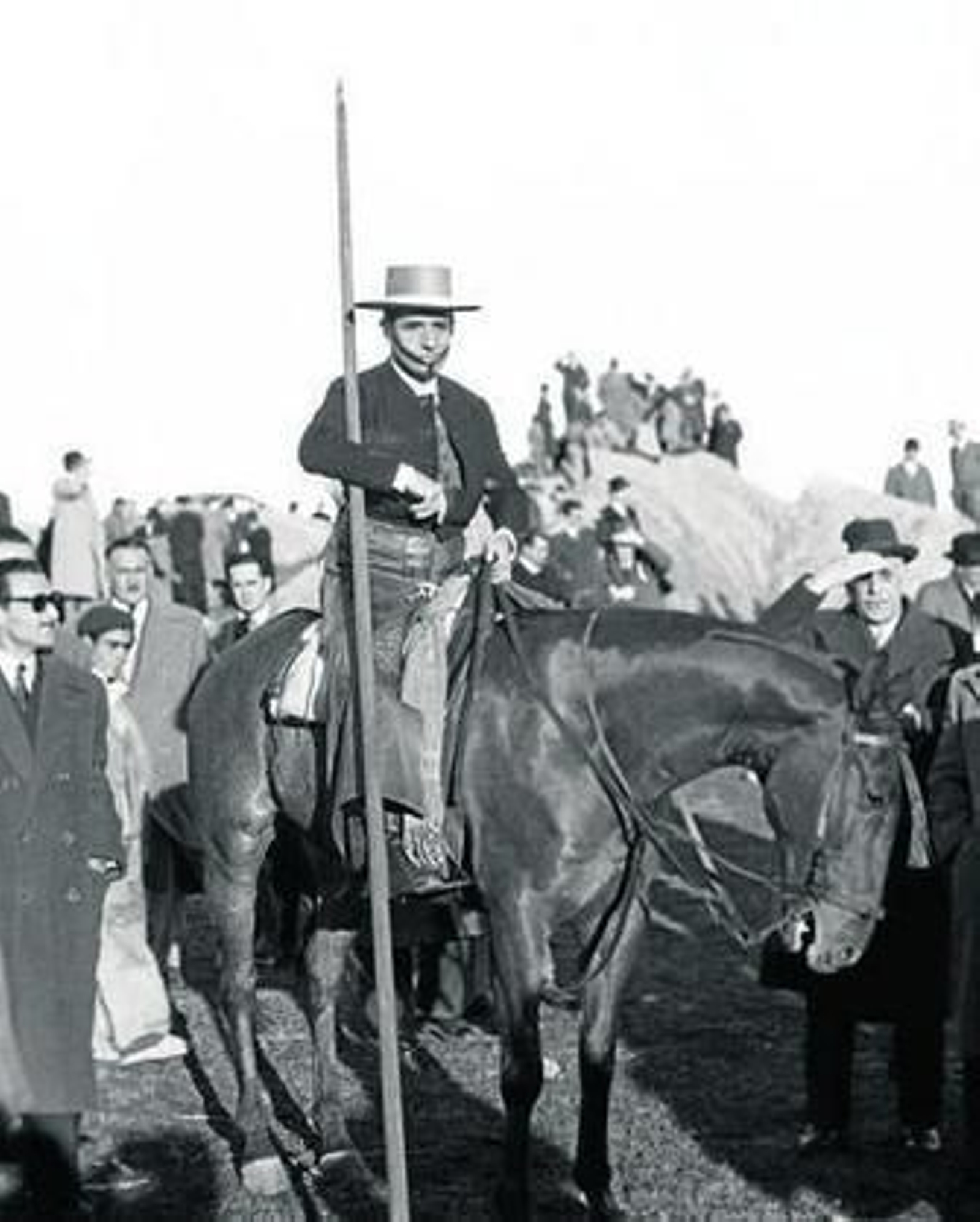 Juan Belmonte, a lomos de una de sus cabalgaduras, preparado para una faena campera.
