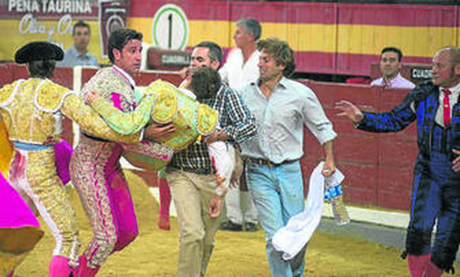 El toro lo enganchó por el brazo derecho arrastrándolo por toda la plaza colgado del pitón, una dramática y espeluznante cogida que dejo sobrecogida la plaza.