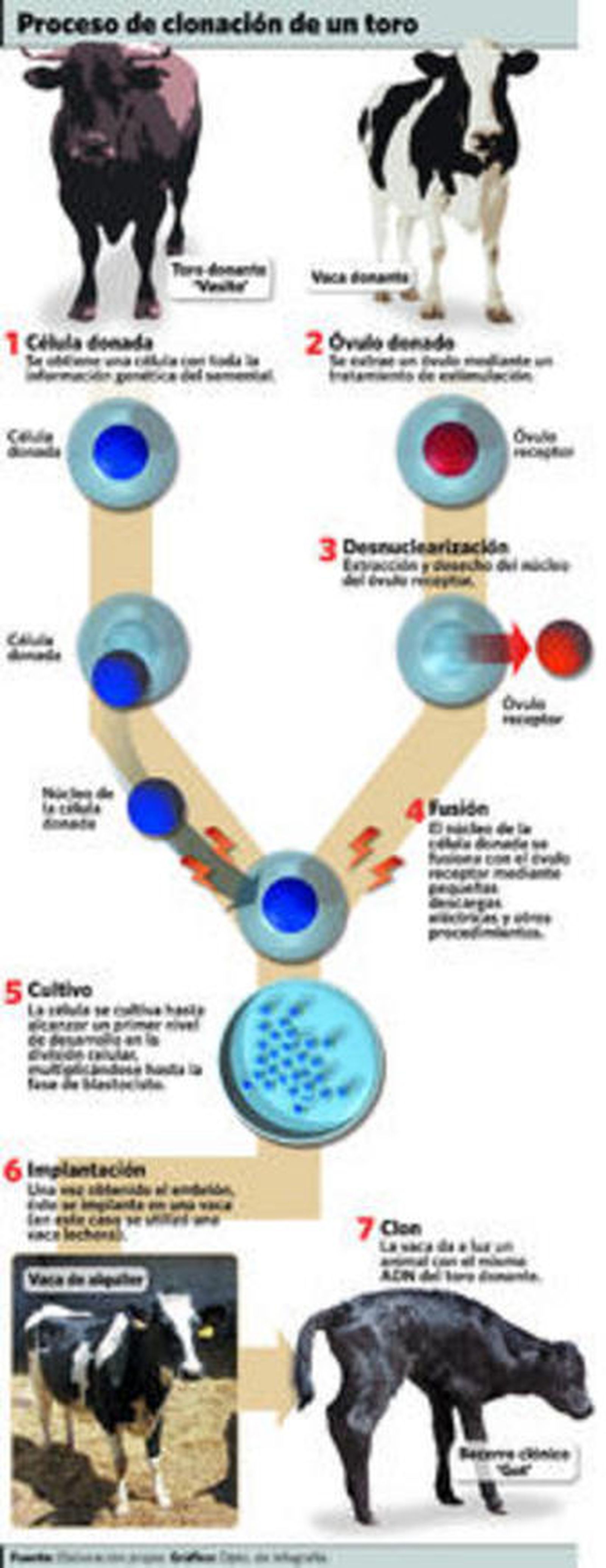 La historia de estas clonaciones comenzó hace tres años, cuando VIVE se dirigió al ganadero sevillano, quien les ofreció su apoyo para un proyecto cifrado en unos 28.000 euros. Tomaron como medio centímetro de piel de Vasito, del que se extrajo una célula. De ahí se obtuvo el núcleo -donde reside la información genética-. Por otro lado, se utilizaron óvulos. Tras eliminar su ADN se introdujo en ellos el núcleo del animal que se va a clonar. En el laboratorio se obtuvo el embrión, que se implantó en la vaca.