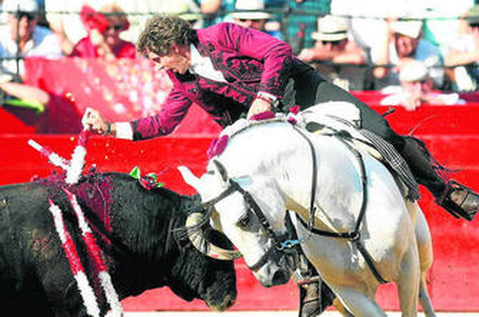 Pablo Hermoso, que abrió el cartel, y que se marchó a la zona de sol de las peñas, se prodigó en su primer toro con todo su repertorio que fue del agrado del público. Tanto en los rejones de castigo como en las banderillas largas y cortas, y con el rejón de muerte le hizo de todo al toro, que con pocas fuerzas a penas ponía en peligro al hábil y gentil caballero.