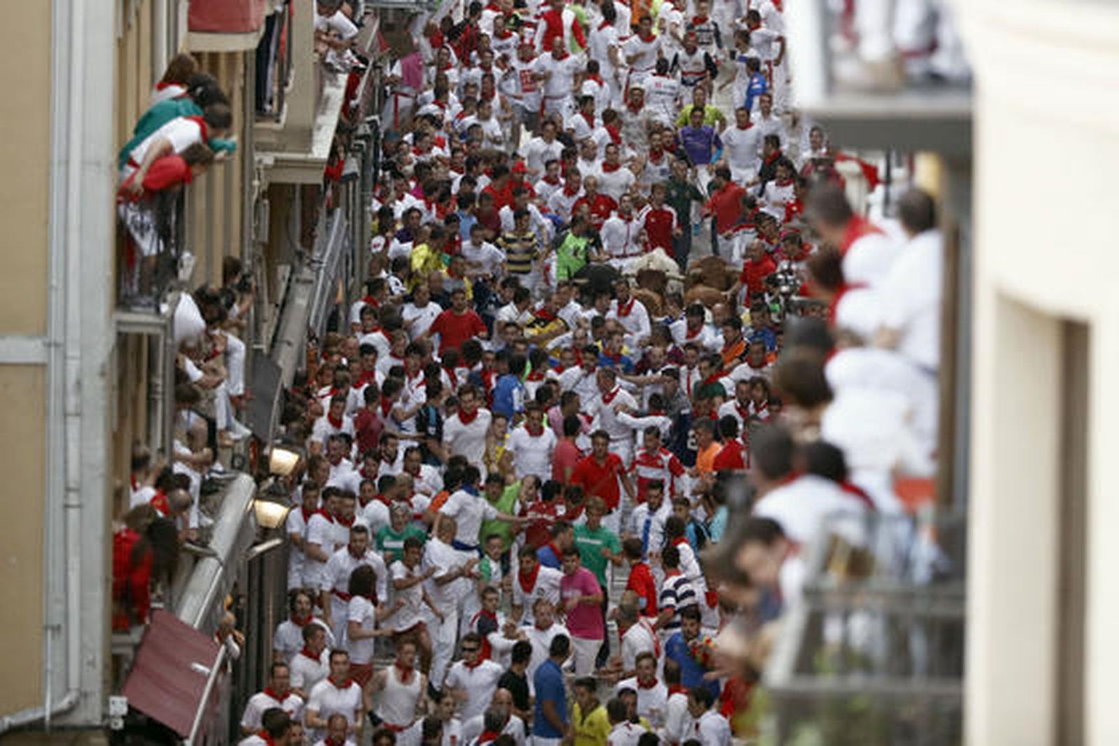 Después de salvar sin problemas la Curva de Mercaderes, la torada ha seguido limpiamente y a gran velocidad por la calle Estafeta, donde, mientras un manso y varios toros se disputaba la cabeza del grupo, se han podido ver bonitas carreras.