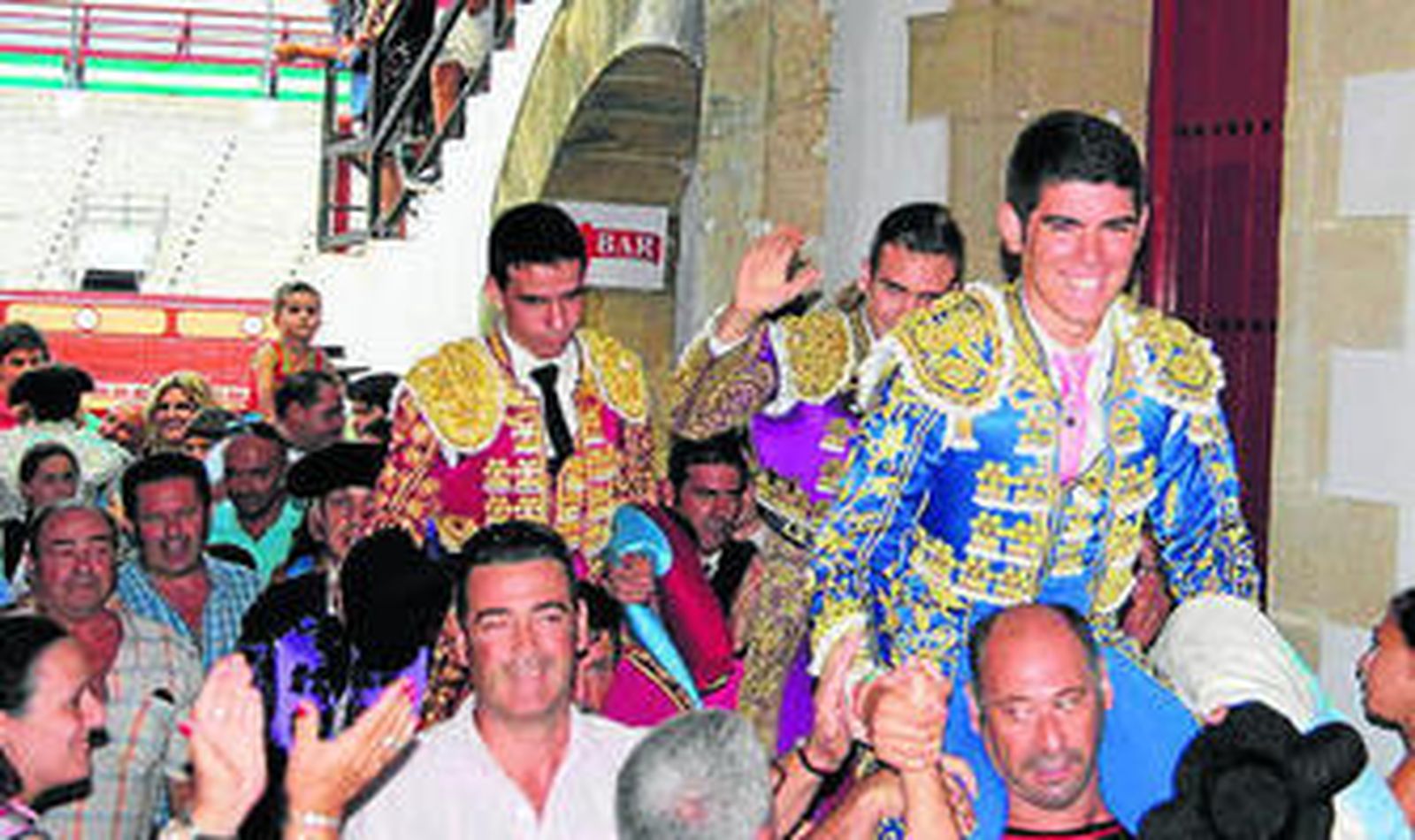Los alumnos en competencia rayaron a gran altura hasta el punto de que tres de ellos salieron a hombros por la puerta grande con dos orejas en el esportón, en la foto. Santiago Muñoz de la escuela "Rafael Ortega" de San Fernando, dos orejas; Juan de María de la escuela "La Gallosina" de El Puerto, dos orejas; José A. Lavado de la escuela de Málaga, dos orejas. Diego Luque de la escuela de Algeciras, oreja y Manuel Navarro de la escuela "La Gallosina", que lidió el añojo.