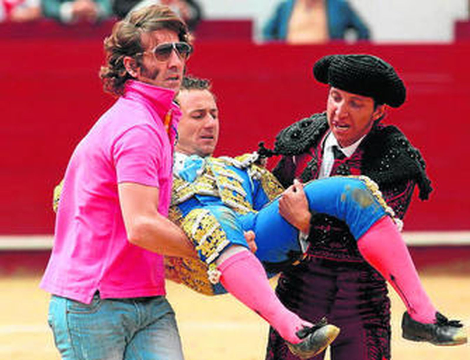 Por eso mismo salió a arreado con el quinto, al que abrió faena con las dos rodillas en tierra. Fue éste un "santacoloma" engatillado y con un astifinísimo pitón derecho que usó como una certera daga para ahondar muy profundamente en las carnes de Rafaelillo, en cuanto éste se levantó del suelo. Desde el primer momento se tuvo la sensación de que la cornada era muy fuerte.
