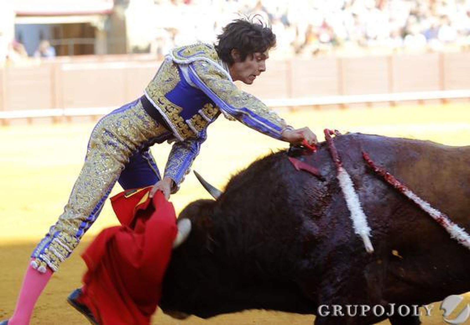 Joselito Adame volvió a jugársela en esa ruleta rusa que es la suerte a portagayola, ante ese portón tan gigantesco de toriles de la plaza sevillana. Más ruleta rusa delante de un cañón, por sus dimensiones, que de una pistola. El hidrocálido tiró de tela un pelín antes de tiempo y volvió a meter el miedo en el cuerpo a los espectadores. Las verónicas no pasaron de ganar terreno. Y en el trasteo hubo arrojo y detalles de calidad, desde una apertura con muletazos por alto a pies juntos, muy ceñidos, junto a tablas del 5, hasta un cierre arrebatador con la diestra, en el que se echó encima al toro, recibiendo un tremendo porrazo, del que se recuperó. En mitad del camino, en una faena basada en la derecha –mejor pitón del toro–, lo más destacable llegó con unos derechazos muy expresivos, rematados con una trincherilla singular y honda, digna de una escultura. Entró a matar en la suerte contraria, tirándose a ley, de verdad para una estocada entera. El toro buscó tablas y no caía. Pasó el tiempo, con el público atónito, esperando que se derrumbara el cornúpeta para solicitar premio. Adame esperó, sonó un aviso y tuvo que echar mano del verduguillo, que empleó en tres ocasiones –dos golpes en el primer intento–. Pese a todo, hubo petición de oreja, que la presidenta concedió.