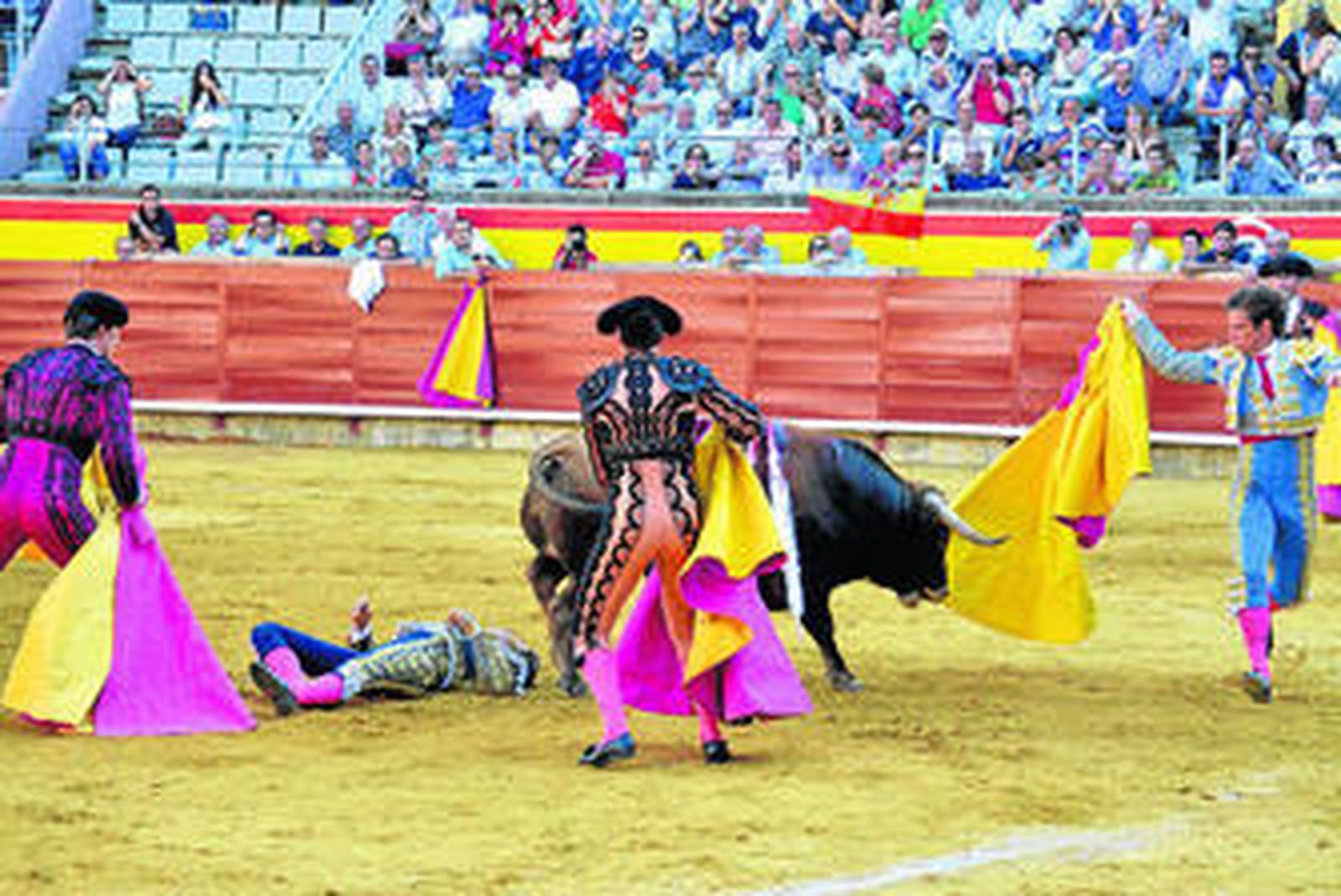 El Juli tuvo que rematar al toro que cogió a Roca Rey y lo hizo con prontitud. En el segundo de su lote protagonizó una faena variada ante un toro de corto recorrido que le obligó a meterse entre los pitones antes de utilizar el estoque con poca fortuna. Muchos muletazos y más enganchones tuvo López Simón en su primero, con el que no terminó de acoplarse ante un astado que iba y venía con sosería y al que su matador dio pases sueltos. En el quinto, que mató en sustitución de Roca Rey, realizó una faena rutinaria y funcionarial, con muchos pases y poco limpios. Mató con prontitud y un público generoso le concedió la oreja.