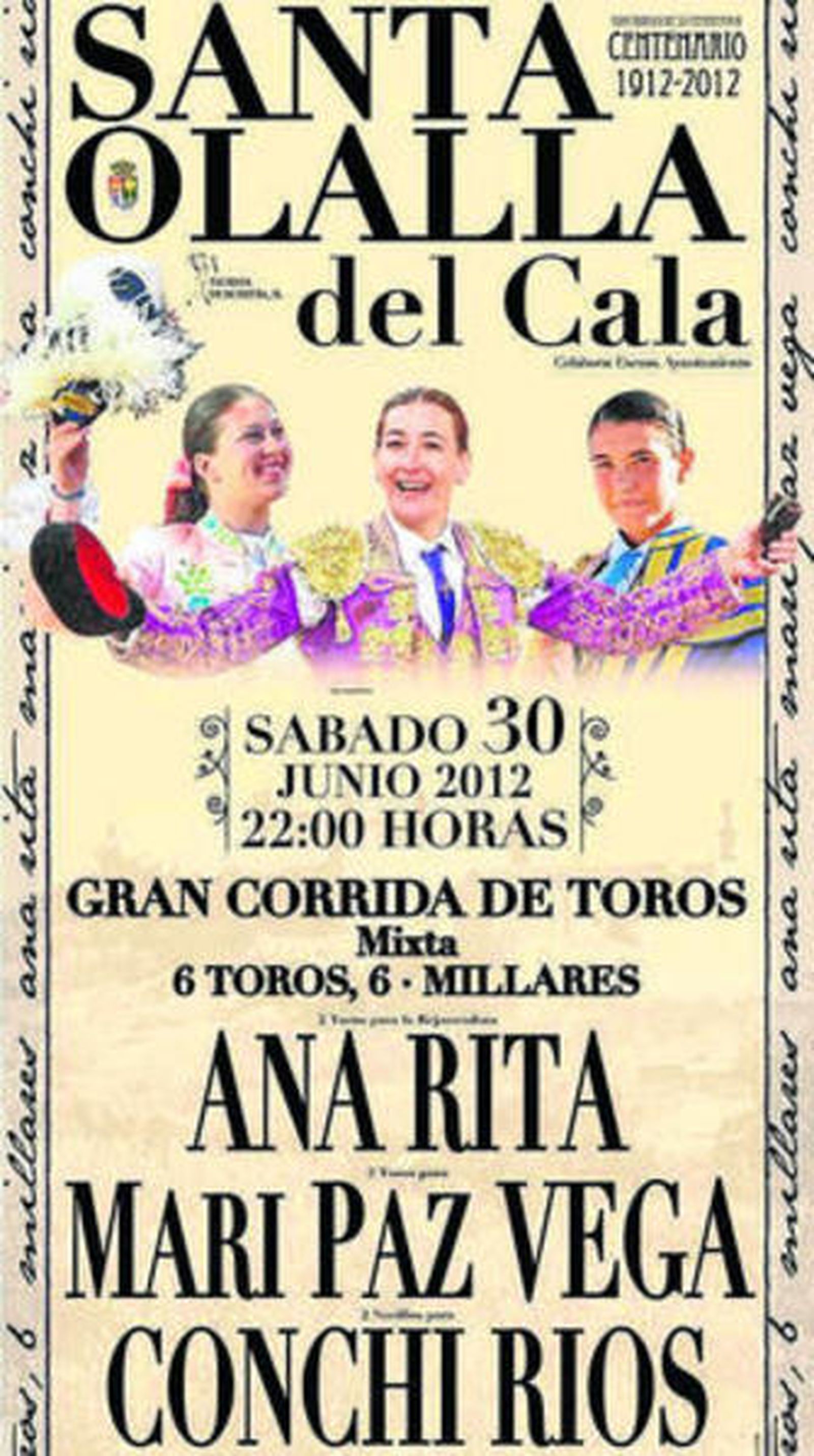 Jorge Buendía, empresario de aquella plaza, ha cerrado un cartel mixto con un total matiz femenino para la conmemoración del centenario de la plaza. El festejo tendrá lugar el 30 de junio, a las 22:00, y frente a toros de Manuel Ángel Millares estarán la rejoneadora Ana Rita, la matador de toros Mari Paz Vega y la novillero Conchi Ríos. Todo hace indicar que el festejo va a ser retransmitido por Canal Sur Televisión.
