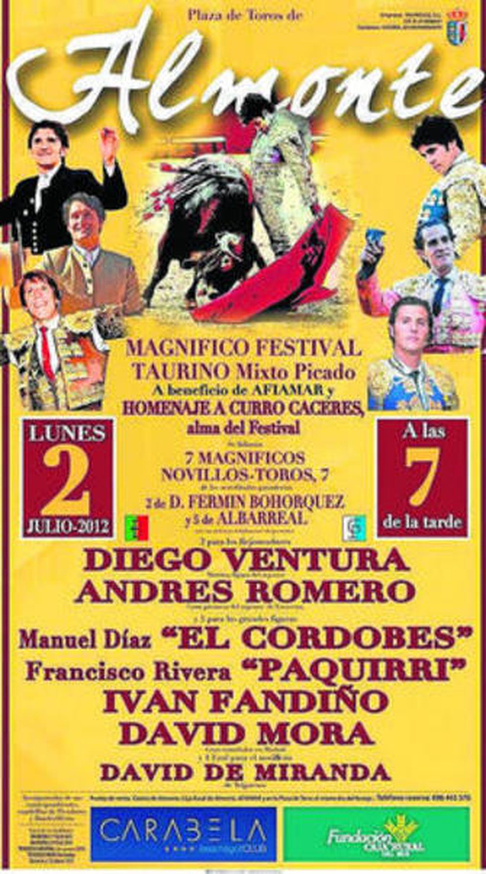 Extraña presentación de un cartel que ya llevaba pegado por las esquinas varios días, pero bueno, presentación al fin y al cabo que sirve, además, para dejar constancia más que nada que la figura de Curro Cáceres, uno de los principales soportes y argumento fiel de este festival, será homenajeada en esta edición, toda vez que Curro falleció recientemente y Almonte y el mundo del toro le deben, sin lugar a dudas, este reconocimiento.
