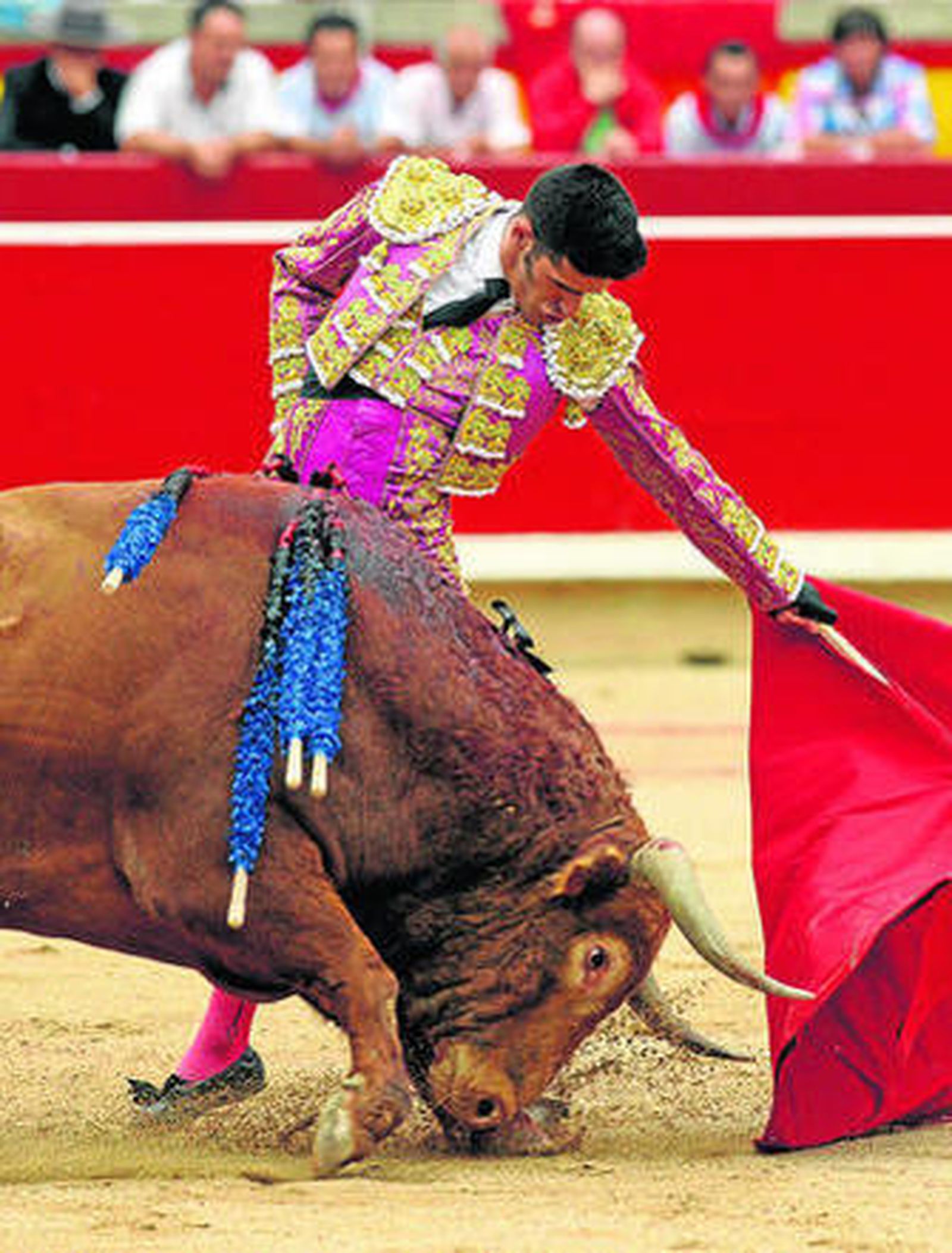 El segundo, el toro de menor peso de la corrida -515 kilos- se rajó pronto y deslucía las suertes porque salía con la cara alta. Sin embargo, Talavante, con máxima entrega, oficio y valor concretó una actuación intensa, muy ovacionada. Brilló con variedad capotera -verónicas, medias, chicuelinas, tafalleras...-. El pacense comenzó la faena de manera explosiva, en los medios, de rodillas. En esos terrenos brilló especialmente en una serie diestra en la que bajó la mano y otra con la izquierda. Cerró con guiños a la galería, de rodillas junto a tablas y unas manoletinas. Tras la estocada, por trasera, precisó de un descabello y el premio quedó en un trofeo.