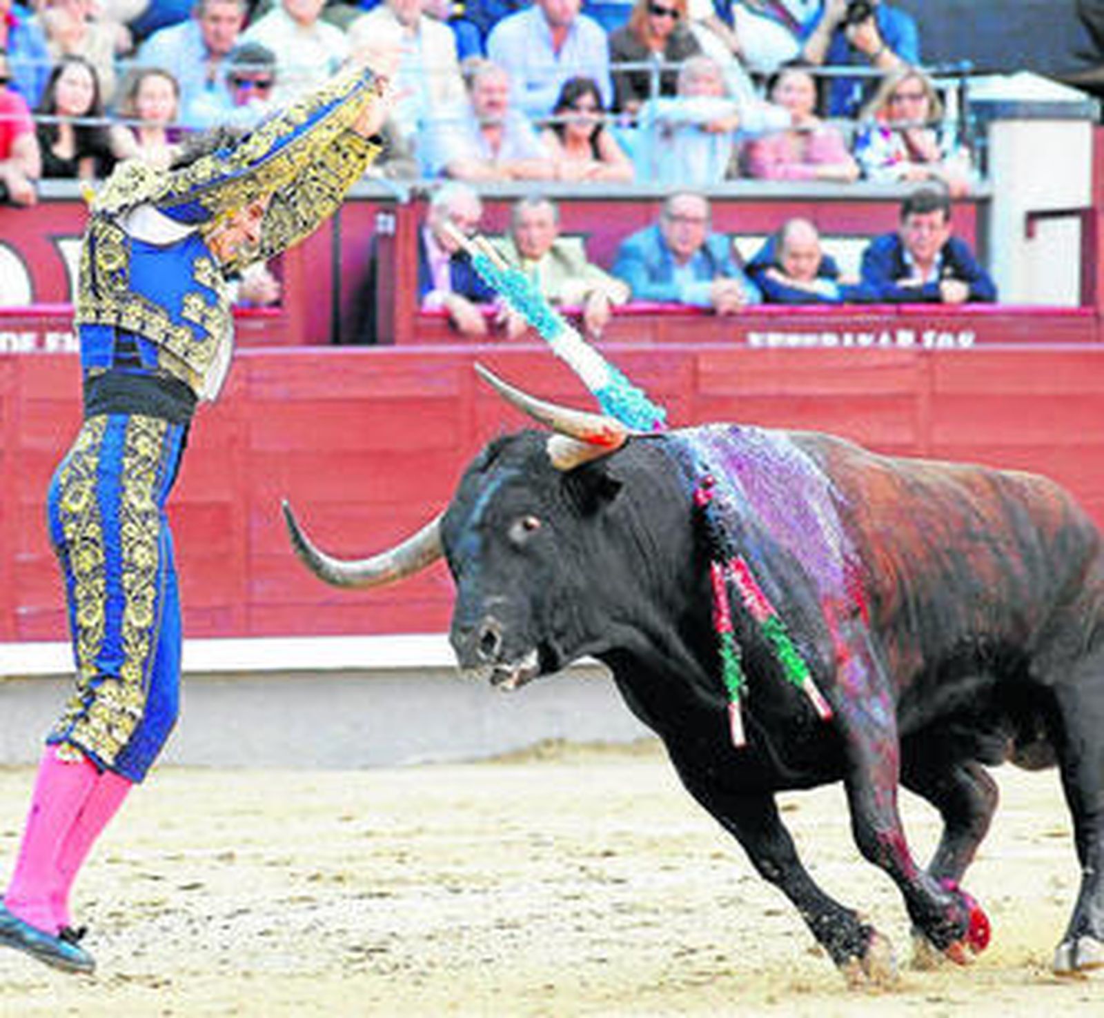 Jiménez tampoco resolvió nada, a pesar de que a sus manos fue a parar el único toro que parecía que se iba a dejar, el tercero. Toro justito de fuerzas, algo más noble, pero sin llegar a romper. Hubo una tanda a derechas, limpia, ligada y con cierto poso. Pero en la siguiente, la interrupción de un inoportuno desarme lo desbarató todo. Ya no fue capaz de remontar, entre otras cosas porque por naturales el toro iba de uno en uno y sin humillar.