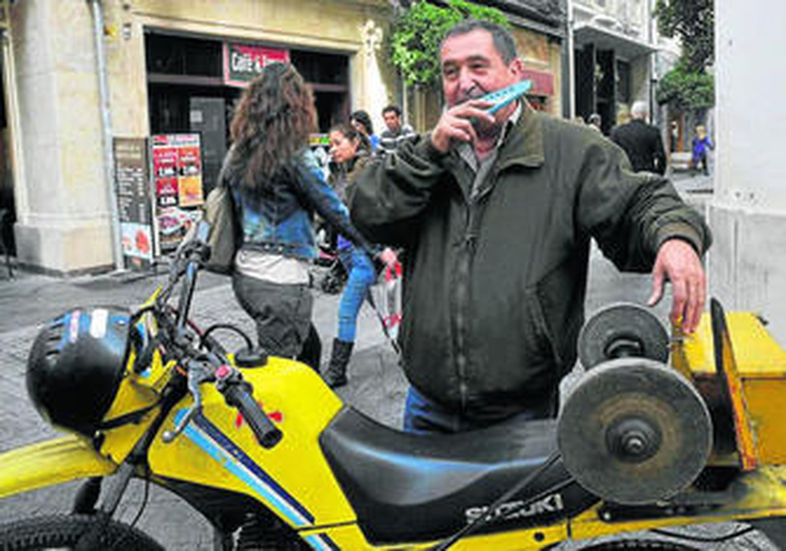 El afilador, ese comerciante ambulante que anuncia su llegada con un sonido inconfundible, cual flautista de Hamelín. Con los nuevos tiempos, cambia su vieja bicicleta por la moto, pero, tras su paso, la estampa parece hacer caso omiso al avance del tiempo y la nueva economía.