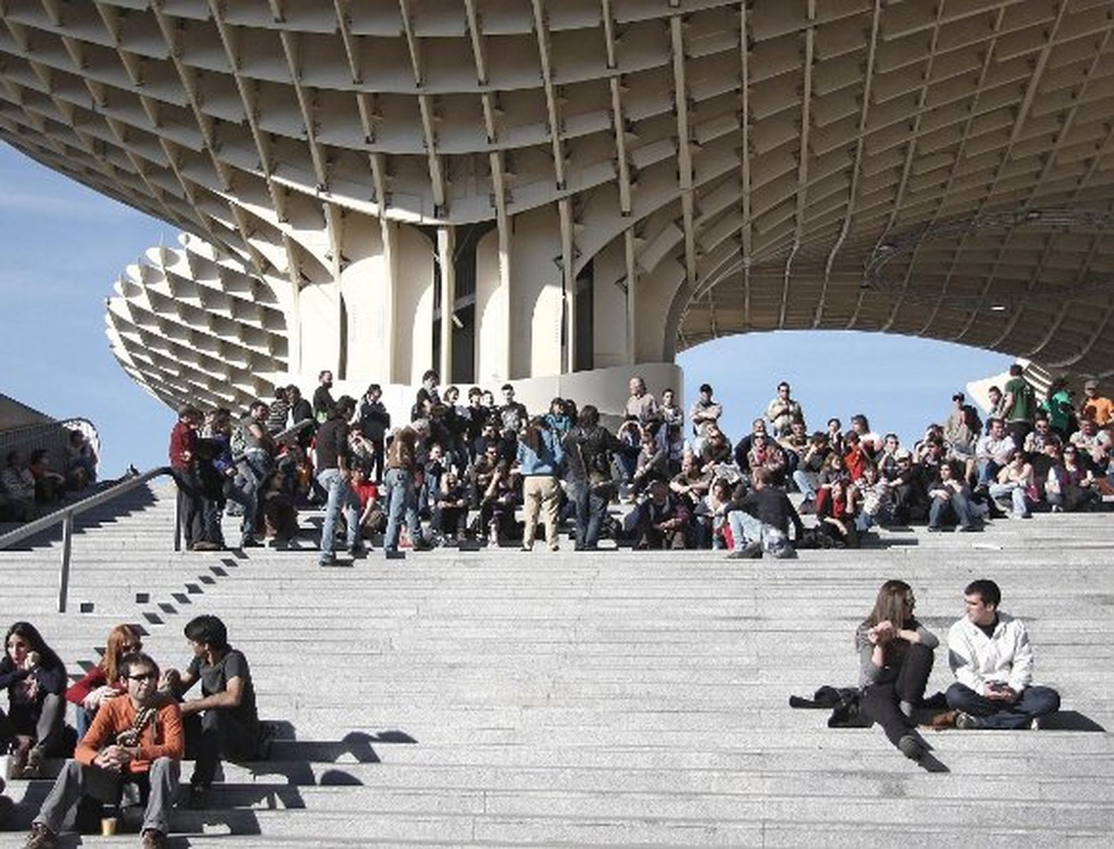 El nombre de Metropol Parasol de la Encarnación se ha convertido, curiosamente, en su antónimo. En sus escaleras se concentran decenas de personas con el propósito de hacer una parada a la vez que toman los agradables rayos solares propios de esta fecha.